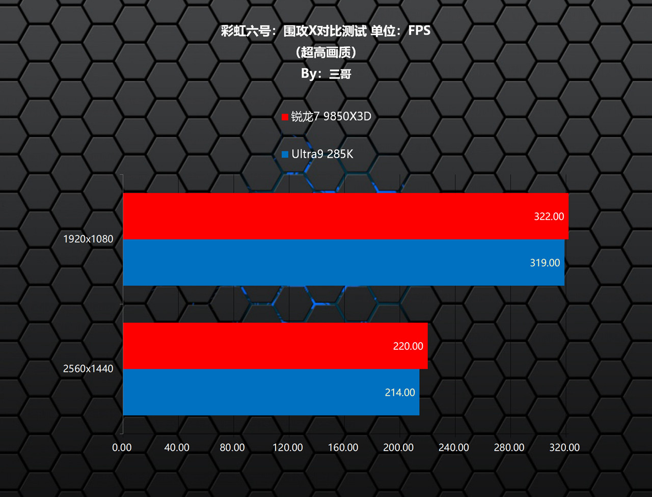 在《彩虹六号:围攻X》测试中,在两个分辨率下均有小幅度的领先,其中1080P分辨率下领先了3.00帧,领先比率0.94%;1440P分辨率下领先了6.00帧,领先比率2.80%。