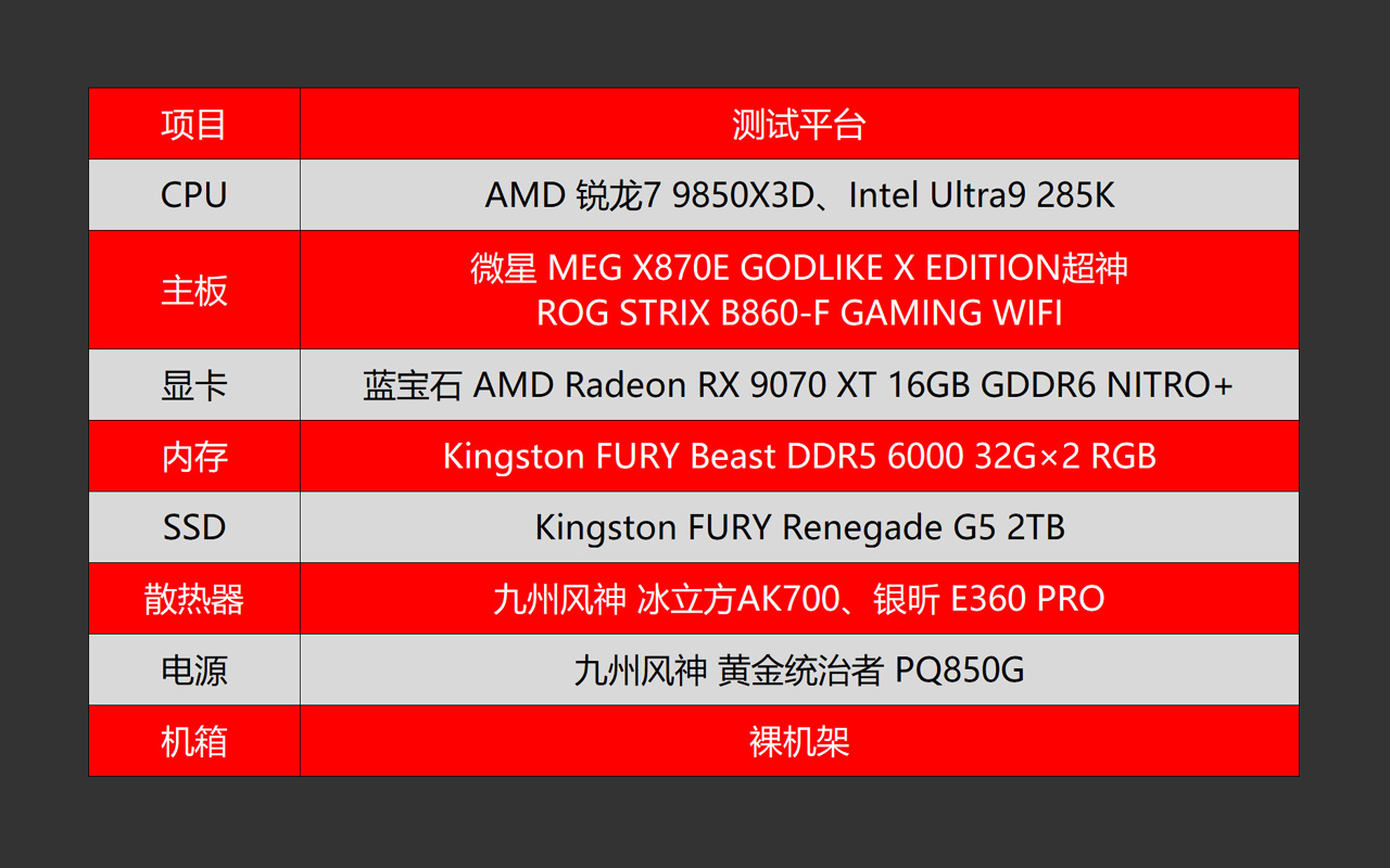 基于此,三哥又重新组建了测试平台,来实测一下9850X3D基于A卡旗舰RX 9070 XT的游戏性能究竟如何。