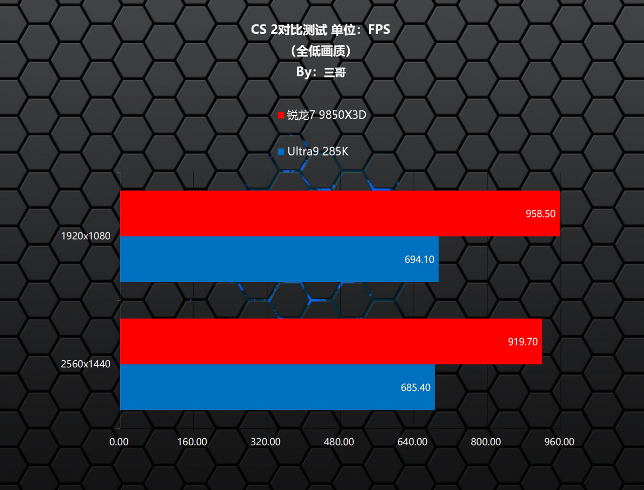 在《CS 2》测试中,锐龙7 9850X3D相较Ultra9 285K,在两个分辨率下均有非常夸张的领先,其中1080P分辨率下领先了264.40帧,领先比率38.09%;1440P分辨率下领先了234.30帧,领先比率34.18%。