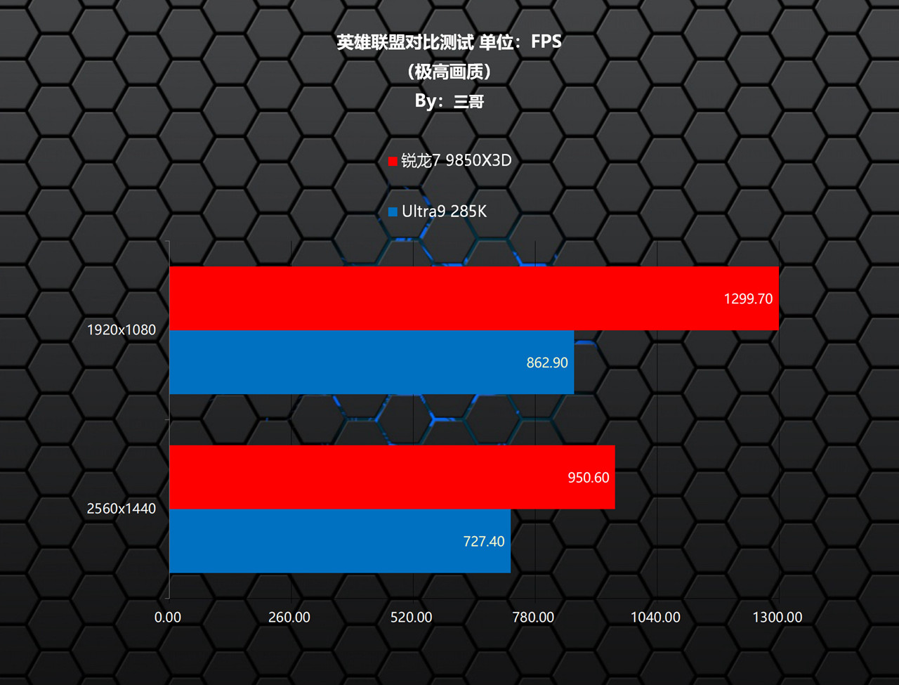 在《英雄联盟》测试中,锐龙7 9850X3D相较Ultra9 285K,在两个分辨率下均有非常夸张的领先,其中1080P分辨率下领先了436.80帧,领先比率50.62%;1440P分辨率下领先了223.20帧,领先比率30.68%。另外,锐龙7 9850X3D搭配RX 9070 XT在该游戏中轻松突破了1200+的超高帧率。