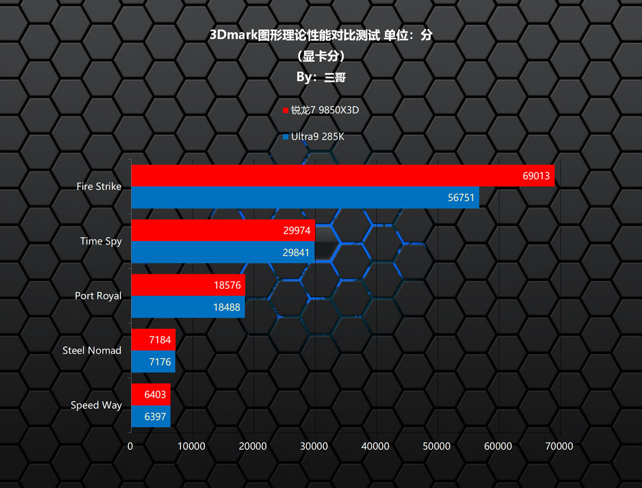 在3DMARK系列图形理论测试中,锐龙7 9850X3D在所有项目中均领先于Ultra9 285K,其中在3DMARK Fire Strike中的领先优势最大,领先幅度高达21.61%。