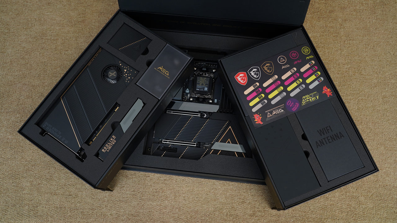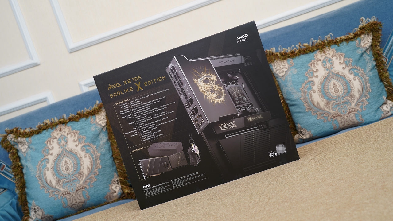 主板选择了微星 MEG X870E GODLIKE X EDITION超神十周年限量版,对于老玩家来说,想必对微星的GODLIKE超神系列耳熟能详吧,GODLIKE超神系列主打不计成本的堆料和创新,可以说是市面上最为奢华的桌面级主板,这张微星 MEG X870E GODLIKE X EDITION超神十周年纪念版比前作有过之而无不及,这一点从其外包装就能看出端倪,本人刚从快递站拿到它时,还以为是一台机箱,不用力根本抱不起来,分量太足了。