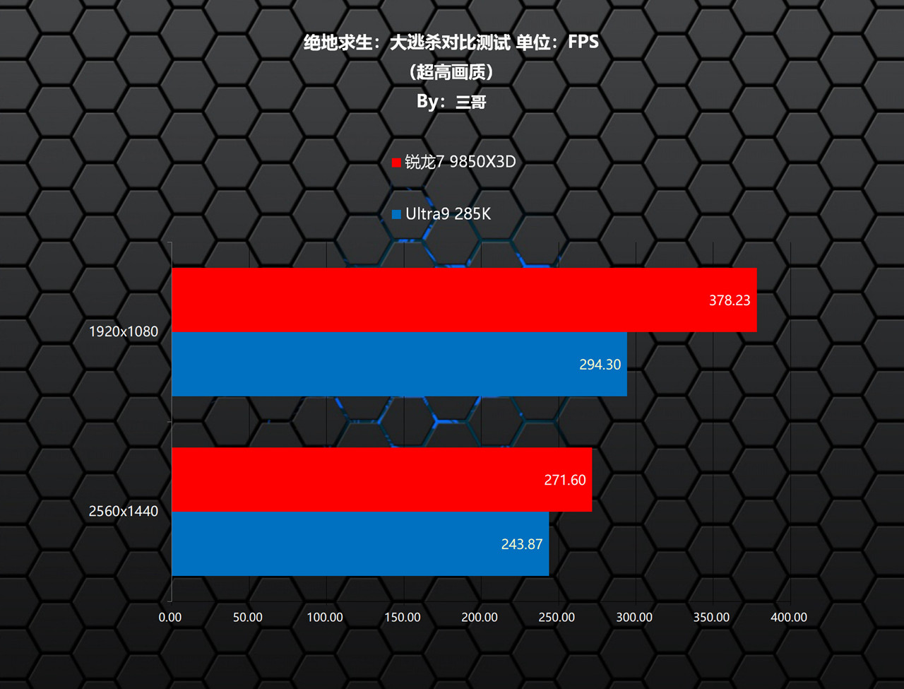 在《绝地求生:大逃杀》测试中,锐龙7 9850X3D相较Ultra9 285K,在两个分辨率下均有大幅度的领先,其中1080P分辨率下领先了83.93帧,领先比率28.52%;1440P分辨率下领先了27.73帧,领先比率11.37%。