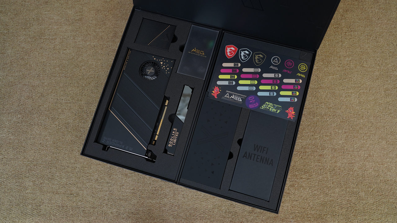 主板提供了非常丰富的配件,并分门别类放置,其中配备了PCIe 5.0 M.2扩展卡、EZ Control Hub集线盒、WiFi天线、各种螺丝和线缆,另外还提供了定制版纪念公仔和收藏展示底座,可以说将奢华体现到了每一个细节。