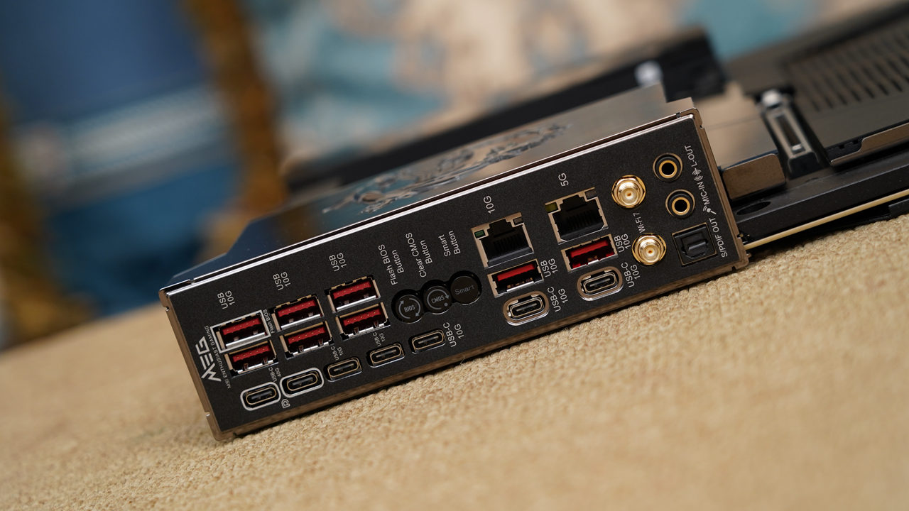 主板采用了黑色一体式I/O挡板,并通过原生接口+子板扩展的形式,提供了非常丰富的接口,主板提供了多达7个USB Type-C接口,其中2个40Gbps USB4 Type-C接口(支持DP)、5个 10Gbps USB 3.2 Type-C接口,主板还提供了8个10Gbps USB 3.2接口,配备了BIOS刷新按钮、CMOS清除按钮、Smart Button按钮和5Gb+10Gb双网口+WiFi7天线,能够方便玩家实现多种拓展和操作。