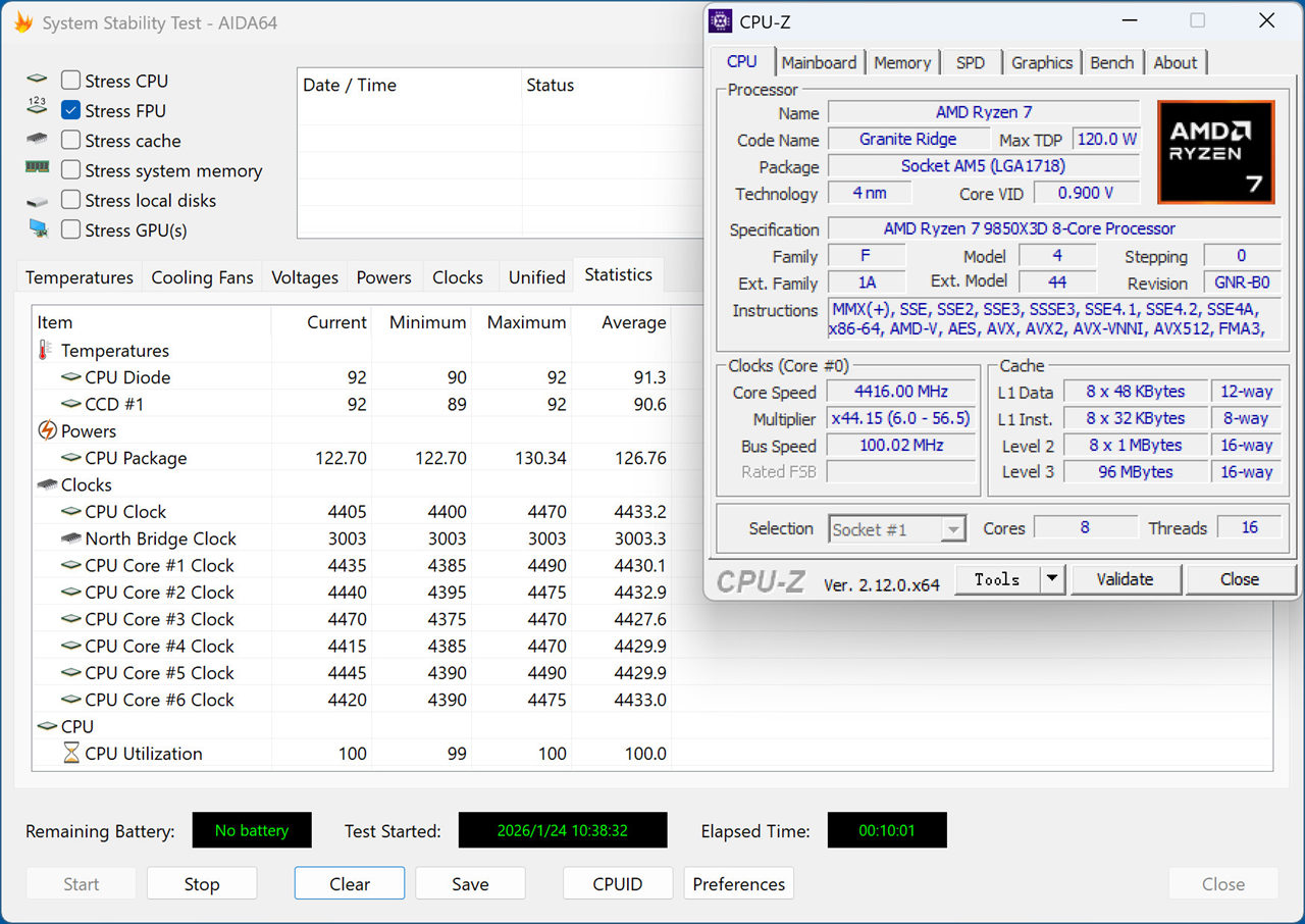 CPU烤机温度对比测试(室温24℃,裸机),由于锐龙7 9850X3D的功耗较低,这一次我们将散热器换成了单塔7热管风冷,可以看出,尽管锐龙7 9850X3D的烤机温度相较360水冷有所上升,但依然属于能压得住的范畴,而Ultra9 285K用同样的风冷是完全压不住的,只能换360水冷。