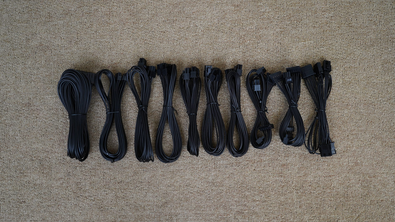 电源标配了10组全模组压纹线,线材做工扎实,品质优秀,其中12V-2x6供电线更是采用了105°C优质阻燃线材和16AWG铜芯,应付高端显卡不在话下。