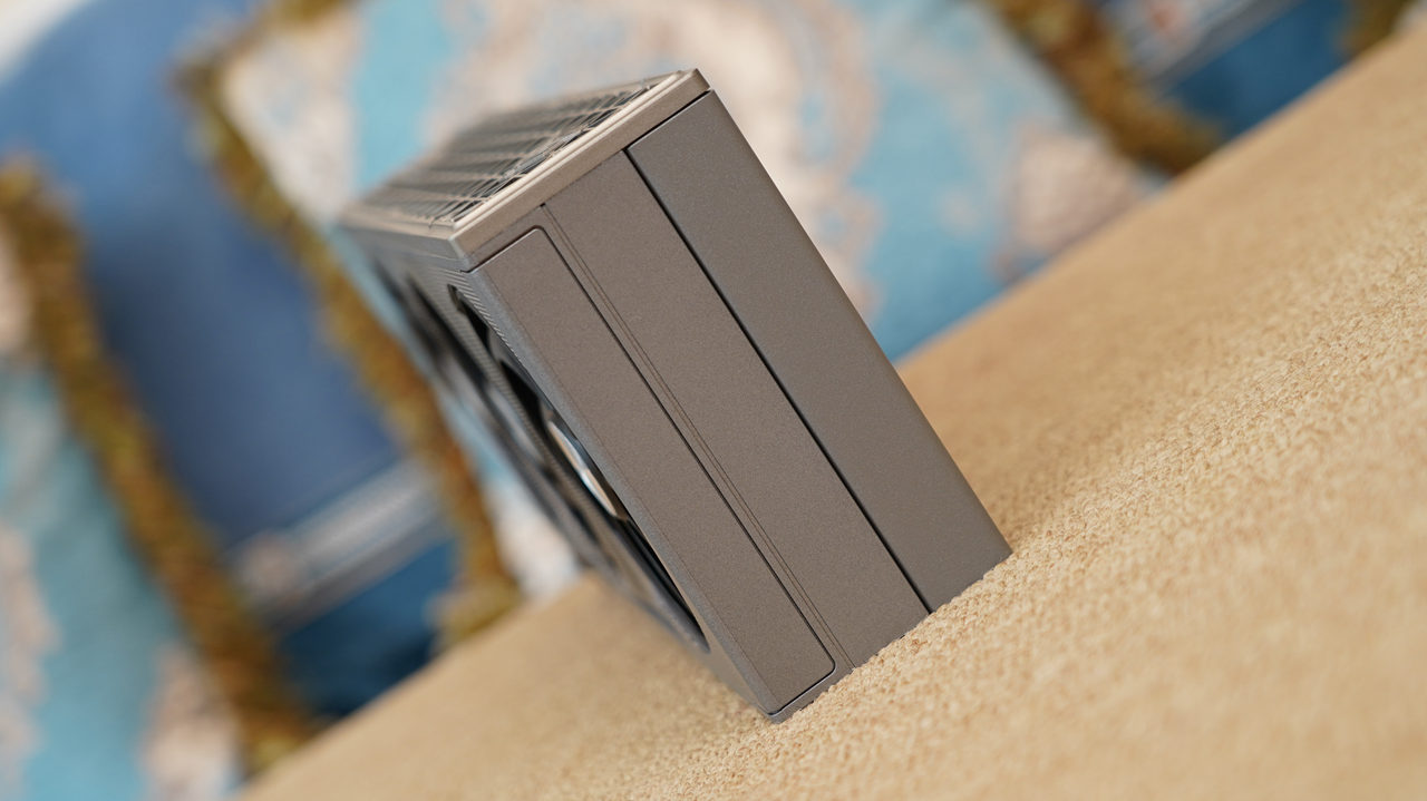 侧面一览,散热器鳍片间采用扣fin+折fin工艺固定,大大保障了牢靠度和美观度。同时可以看出,散热器采用了重心后倾式设计,对高马甲内存的避让性非常好。