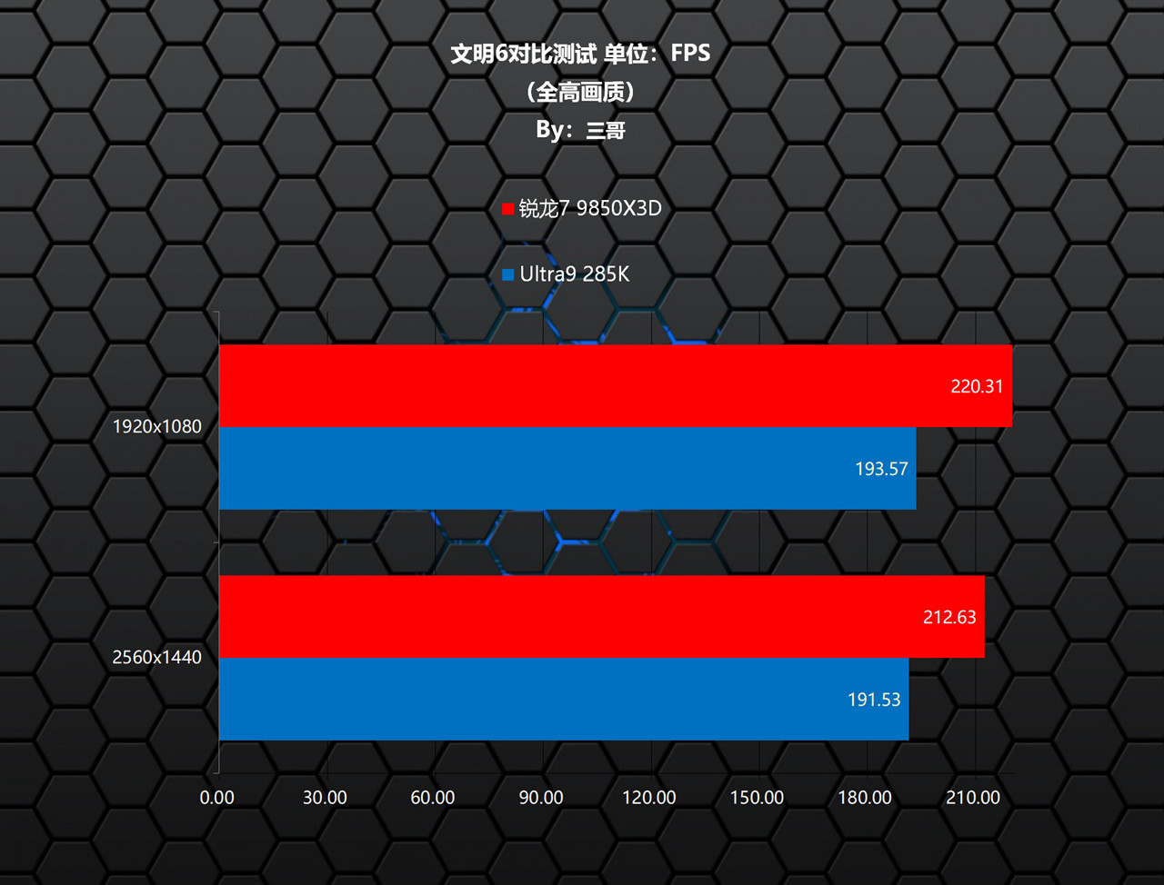在《文明6》测试中,锐龙7 9850X3D相较Ultra9 285K,在两个分辨率下均有大幅度的领先,其中1080P分辨率下领先了26.74帧,领先比率13.81%;1440P分辨率下领先了21.10帧,领先比率11.02%。