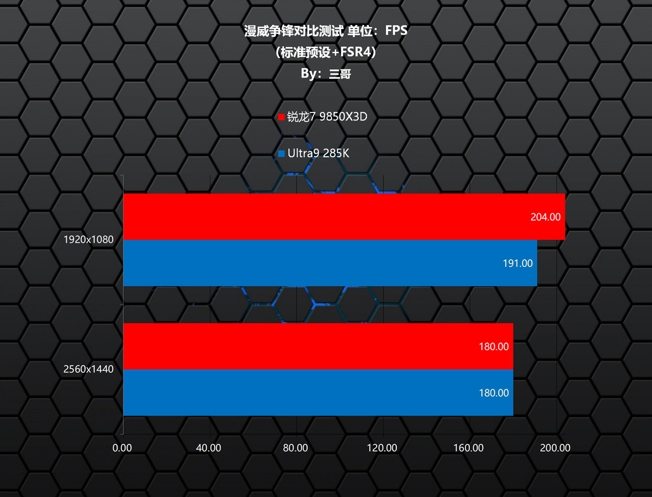 在《漫威争锋》测试中,锐龙7 9850X3D相较Ultra9 285K,在两个分辨率下有不同程度的领先,其中1080P分辨率下领先了13.00帧,领先比率6.81%;1440P分辨率下两者持平。