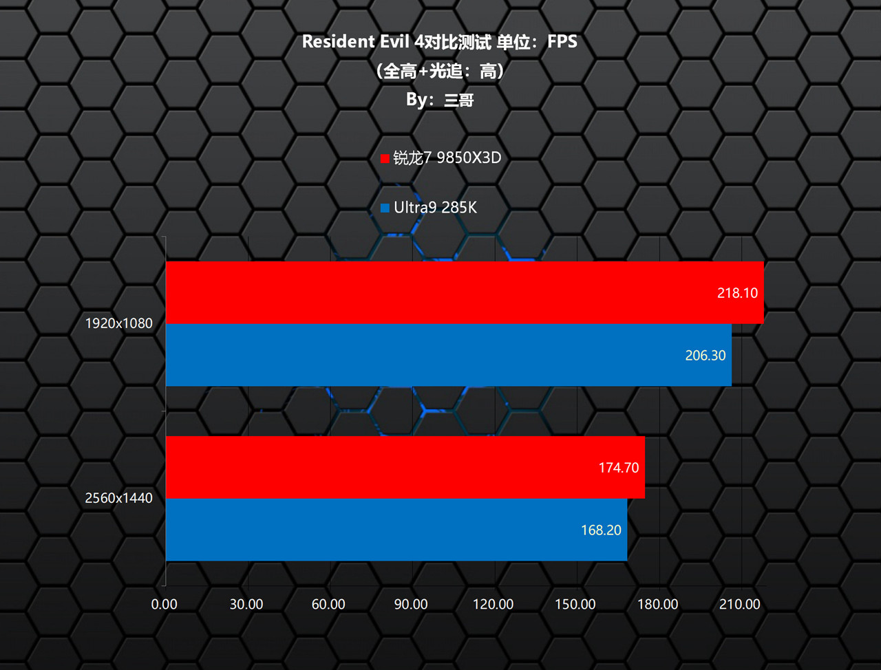 在《Resident Evil 4》测试中,锐龙7 9850X3D相较Ultra9 285K,在两个分辨率下均有小幅度的领先,其中1080P分辨率下领先了11.80帧,领先比率5.72%;1440P分辨率下领先了6.50帧,领先比率3.86%。