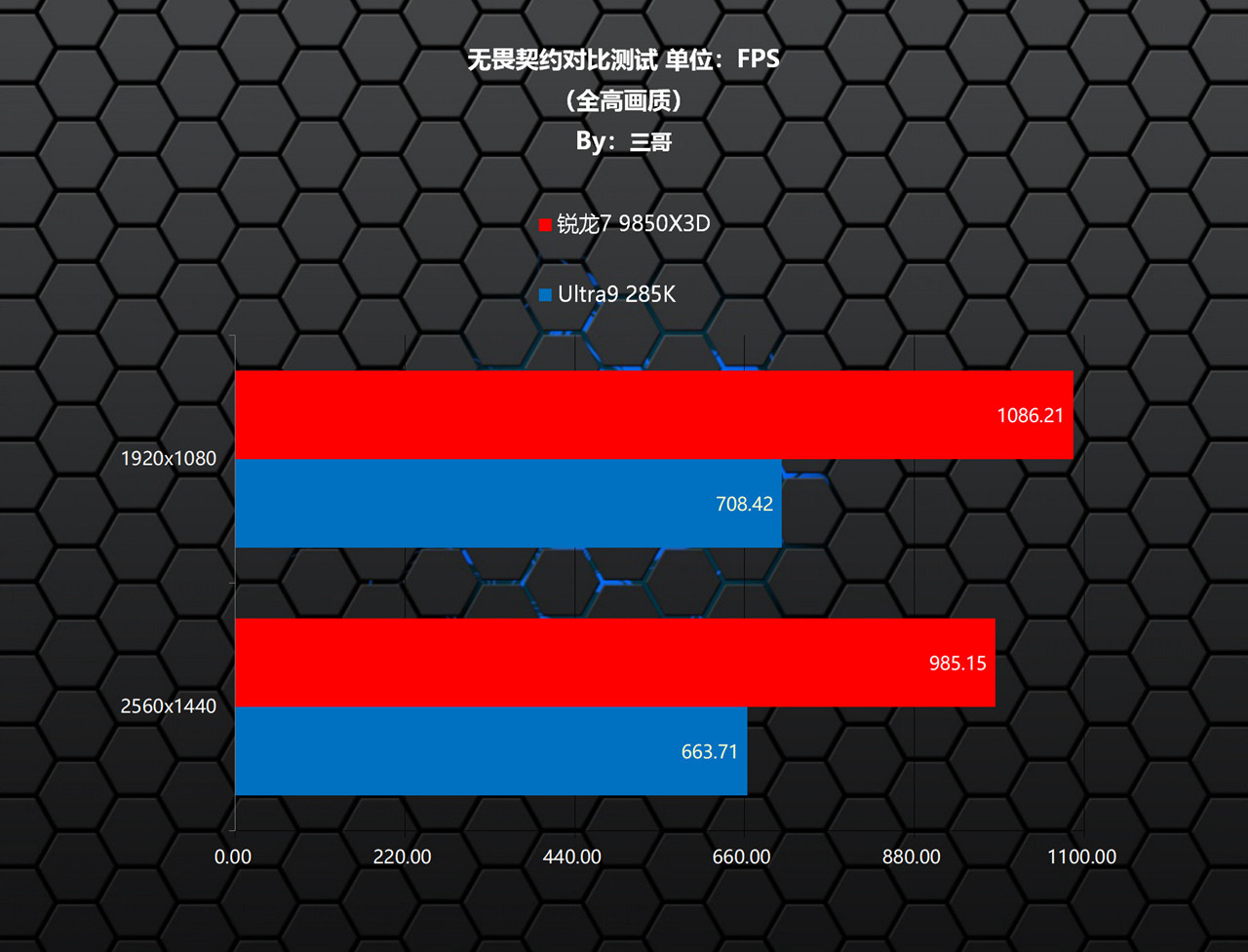 在《无畏契约》测试中,锐龙7 9850X3D相较Ultra9 285K,在两个分辨率下均有非常夸张的领先,其中1080P分辨率下领先了377.79帧,领先比率53.33%;1440P分辨率下领先了321.44帧,领先比率48.43%。另外,锐龙7 9850X3D搭配RX 9070 XT时,也能在该游戏中轻松突破千帧。