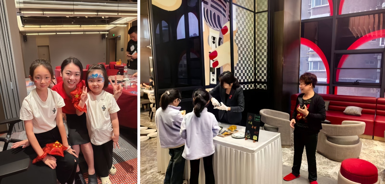 为了让客人深度沉浸于国庆与中秋双节交织的温馨氛围,吉林市丽芮酒店不仅在大堂设置国庆主题互动角,宾客写下对祖国的祝福即可获赠主题礼盒,每日早晨大堂还免费提供面部彩绘服务并派发小国旗、气球等节日礼品。此外,为缓解早餐等位,特在会议室设亲子专座,播放动画电影,提升亲子家庭用餐体验。西安高新丽芮酒店在中秋节当天特别组织了免费DIY冰皮月饼活动,吸引了众多家庭客参与,孩子们在丰富体验的同时也完成了学校实践作业。喆啡酒店北京西站丽泽商务区店也在中秋月圆之夜,精心为小朋友们准备了非遗花灯手作活动,让他们在动手过程中深刻体会到“花好月圆”的传统意蕴。