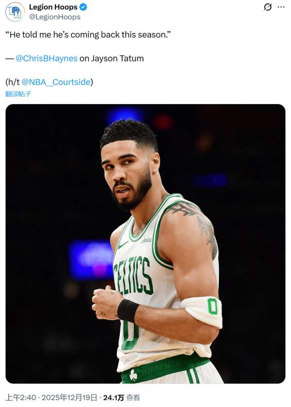 北京时间12月19日,NBA常规赛继续进行。根据名记Chris Haynes报道称,塔图姆亲承本赛季将复出。他在上赛季东部半决赛遭遇跟腱断裂,本赛季目前为止还没有出场过。