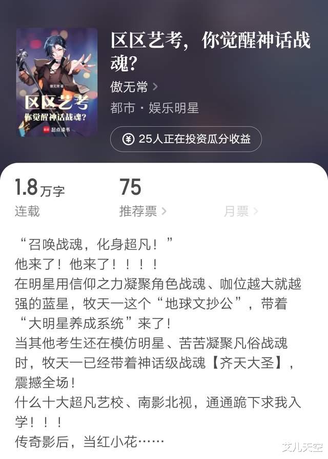 而主角过来后,开启了一个大明星养成系统,这是要将前世的人气角色搬到异界大显神威了。之前的杀青超能力有万订成绩,这次的神话战魂角色如何还是看未来表现吧。
