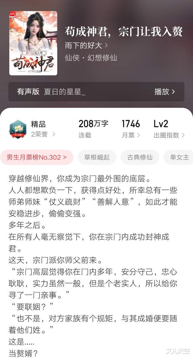之前《人道大圣》《反派皇女》《宇宙级魔神》陆续结束,今天又看到“雨下的好大”的这本《苟成神君,宗门让我入赘》完结了。