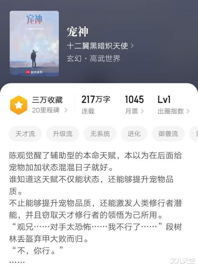 因为更新比较快,时间虽然不长,字数也快两百二十万了。带着御兽文元素的升级文,主角觉醒了一个拉拉队之魂的本命辅助天赋,能够激发别人的潜力。