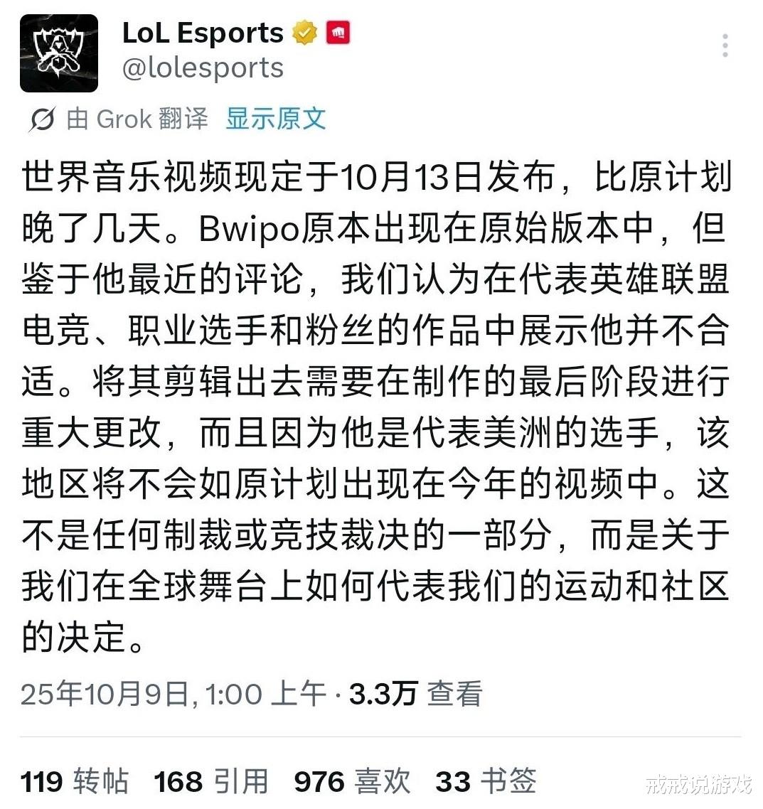 这一决定对即将完成的MV制作带来了实质性影响。由于Bwipo原本是作为美洲赛区的代表选手出现在视频中,移除他的镜头意味着需要进行大量修改工作。最终,拳头决定在今年MV中完全删除美洲赛区的相关内容。拳头官方特别说明,这一决定“并非任何处罚措施或竞技规则相关裁定的一部分”,而是基于“如何在全球舞台上展现这项运动及相关社群”所做的选择。尽管如此,这一举动无疑向整个职业圈发出了明确信号——选手的场外言行同样会受到关注并可能产生后果。