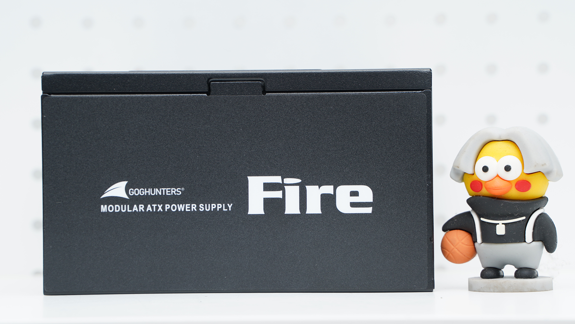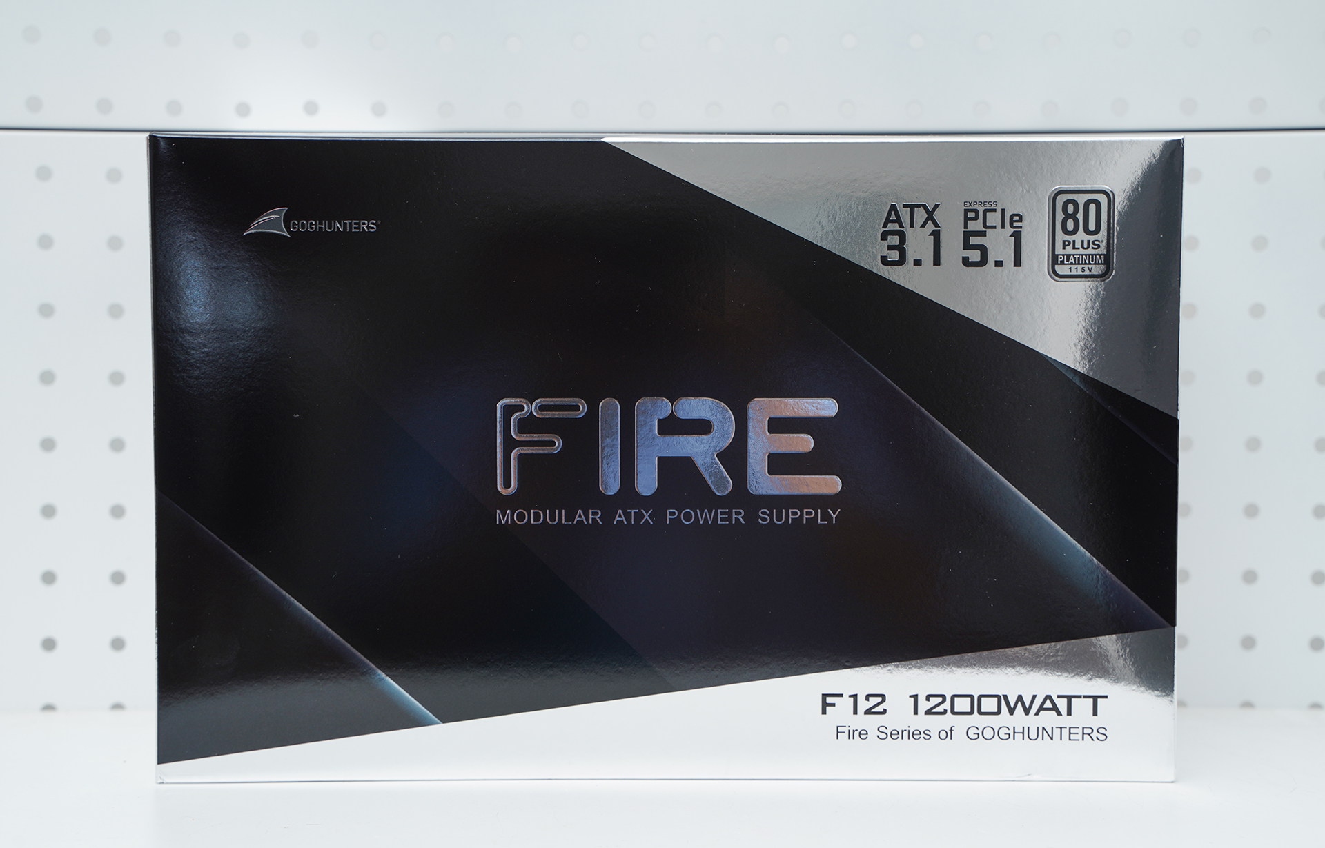 这款电源的包装盒整体以黑银撞色为主,视觉效果简洁而有质感。正面中央是大面积的“FIRE”字样,采用金属反光工艺处理,显得颇有科技感。左上角是品牌Logo「GOGHUNTERS」,右上角则标注了支持的标准:ATX3.1、PCIe5.1,并配有**80PLUS白金认证(115V)**标识,突出了产品的高效能与新规范兼容性。