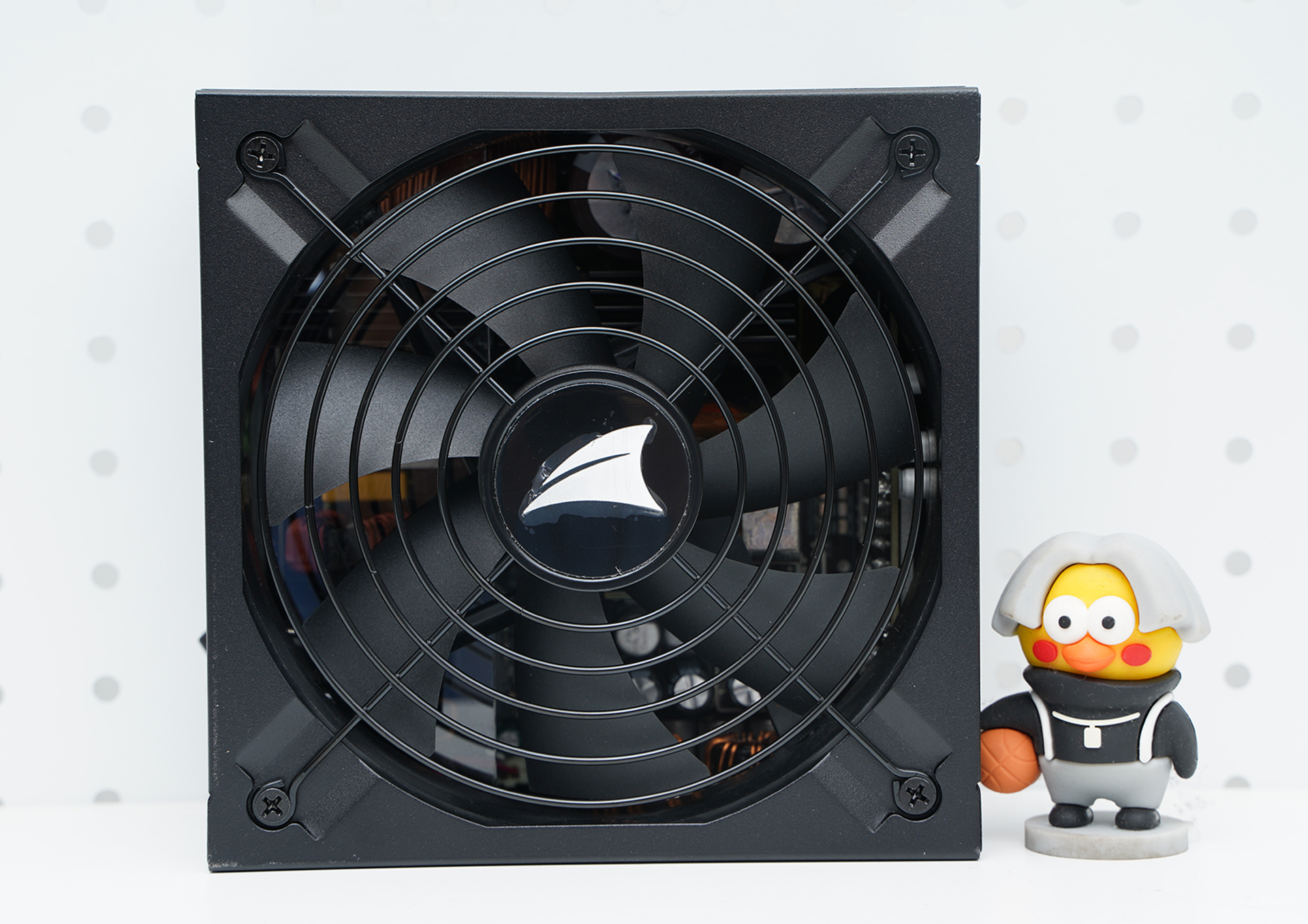这款电源配备了一枚 14cm大尺寸散热风扇,带智能启停功能。在低负载(功耗低于20%)时,风扇会自动停转,与噪音说88;当功耗超过20%时,风扇则会自动启动,保证充足的散热。这样的设计既能在日常轻负载下带来安静体验,又能在高负载运行时确保供电系统的稳定与安全。风扇采用9叶片设计,并配有金属防护网罩,既提升了气流效率,又在结构上增加了安全性。