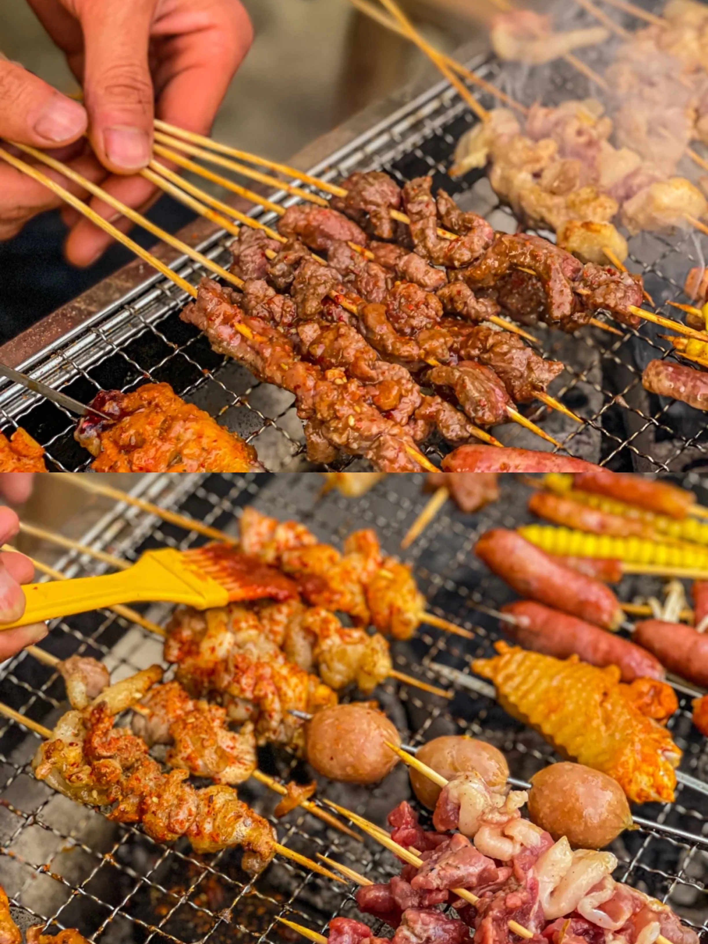 鸡皮串、麦穗肠、腊肠小串、鱿鱼手把须、小黄鱼