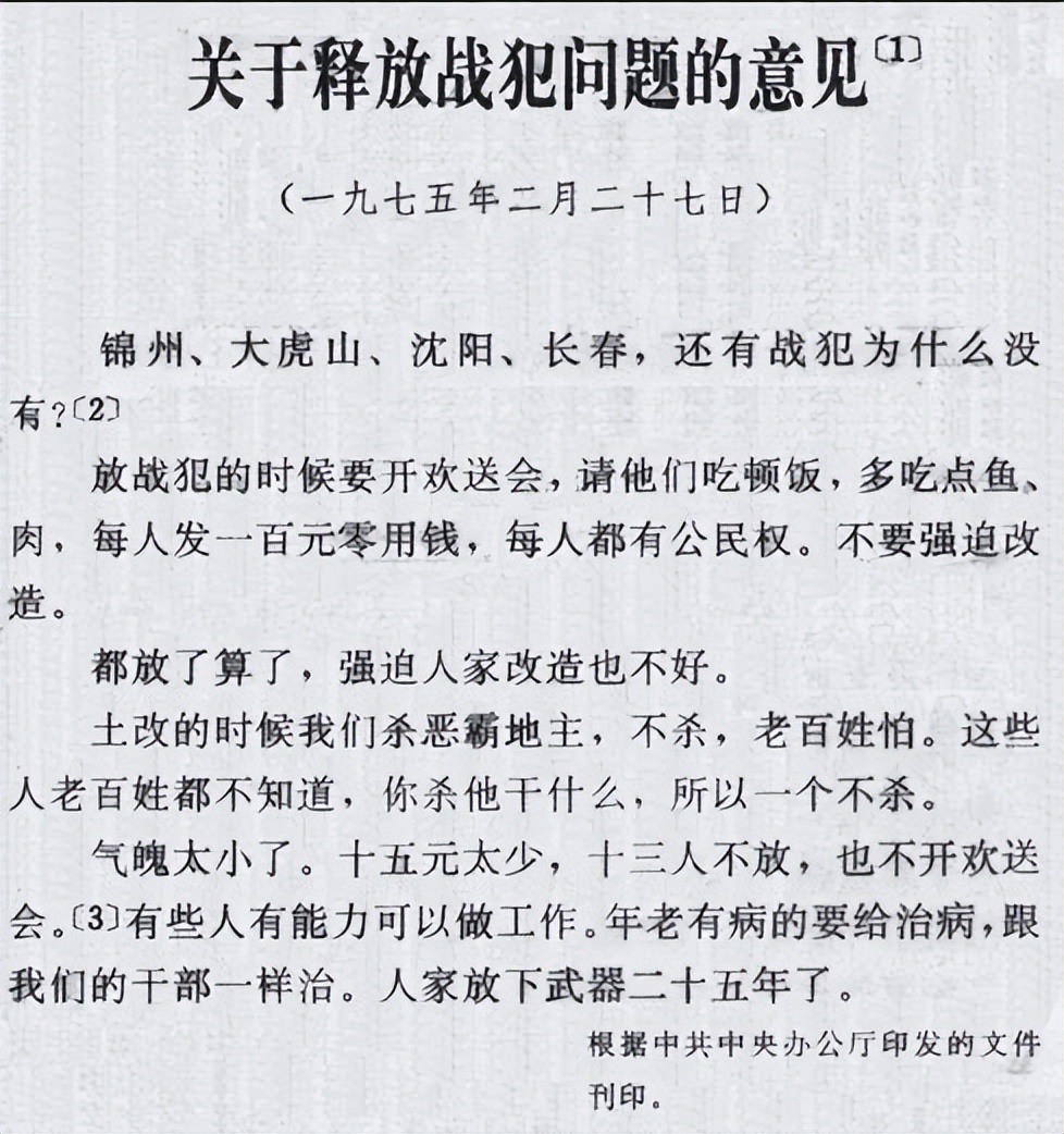 1975年2月27日,这份《报告》送交到了毛主席手中,毛主席看过后,马上提笔做出批示:“放战犯的时候要开欢送会,请他们吃顿饭,多吃点鱼、肉,每人发100元零用钱,每人都有公民权。不要强迫改造。都放了算了,强迫人家改造也不好。”