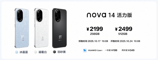 10月17日上午10:08,华为商城及授权渠道正式开启华为nova 14 活力版的预售,售价2199元起,10月24 日正式开售。