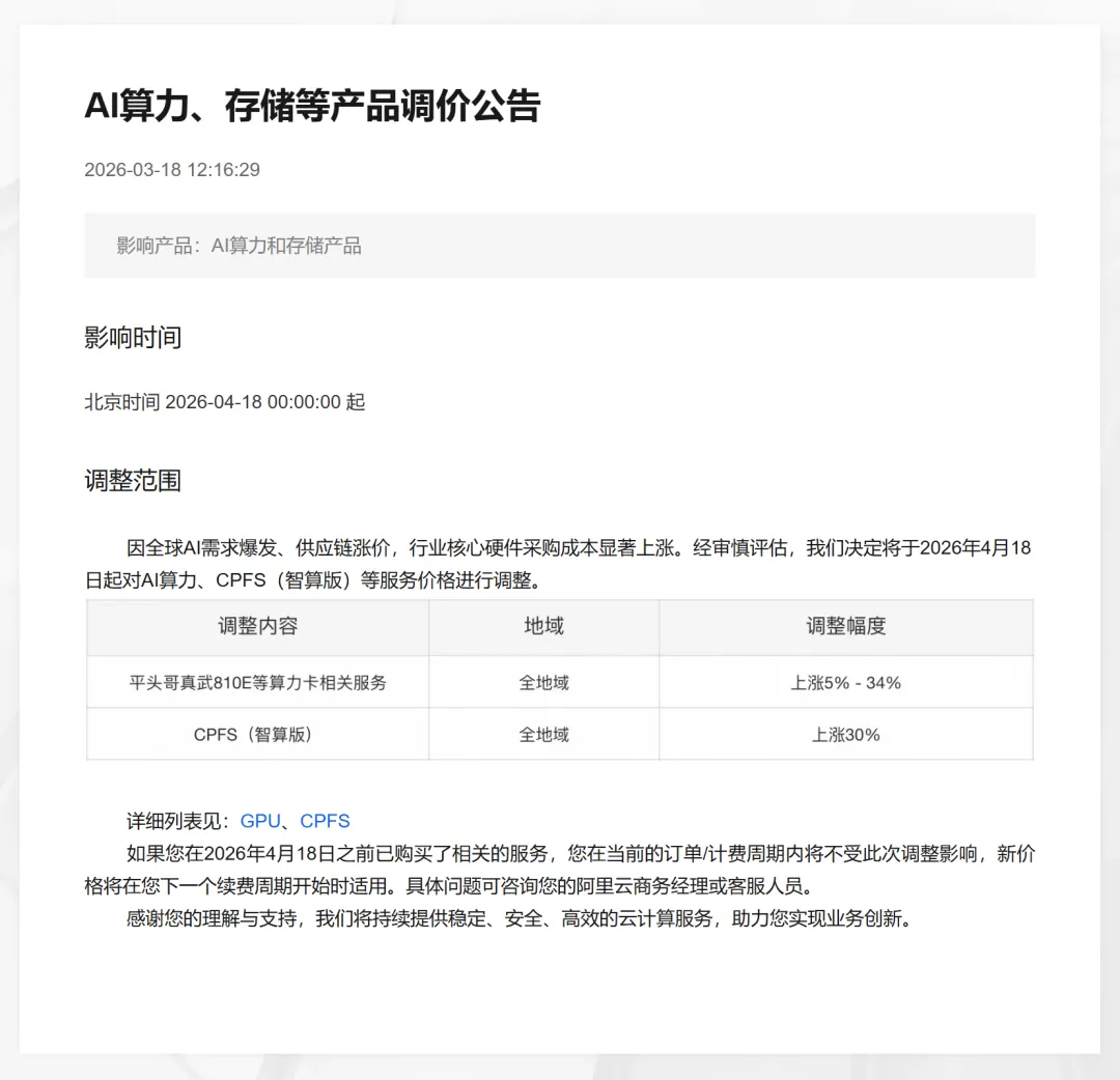 3月18日午间,阿里云官网一则调价公告在科技圈激起千层浪:受全球AI需求爆发式增长及供应链成本上升影响,公司将对AI算力、存储等产品进行价格上调,其中平头哥真武810E等算力卡产品价格上调5%至34%,文件存储产品CPFS(智算版)涨幅达30%。