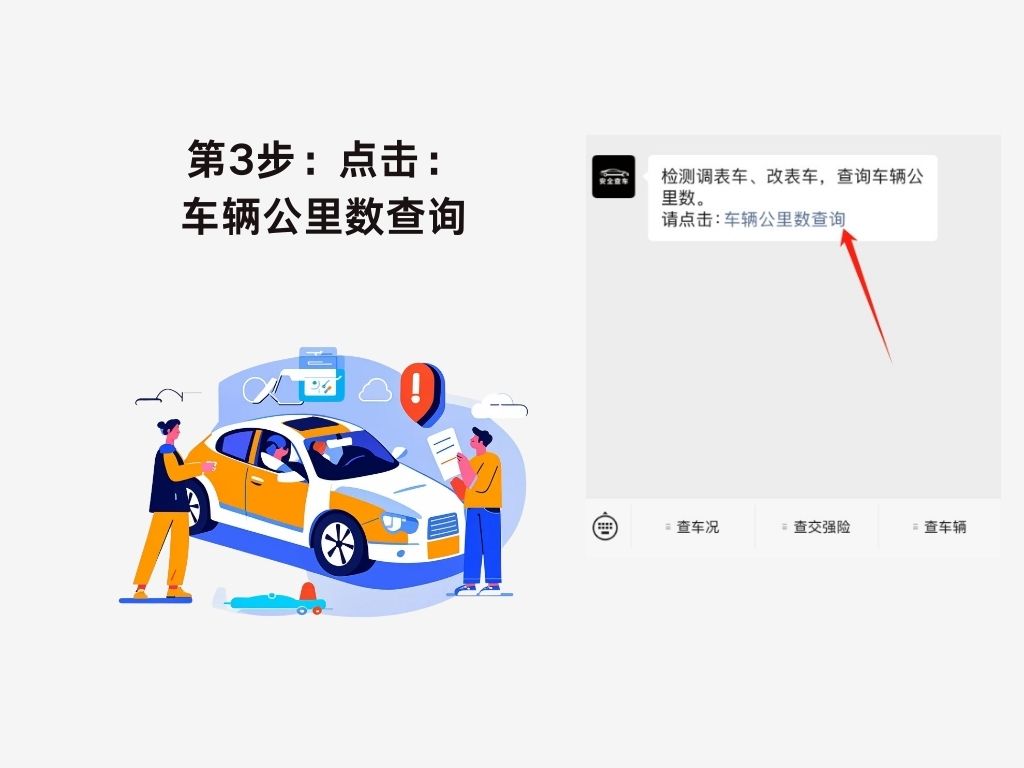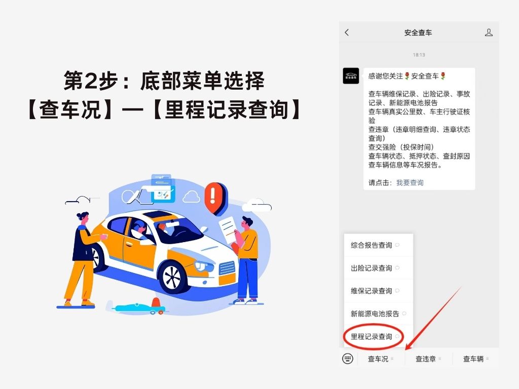 现在在手机上就可以查到车辆行驶公里数,可以快速辨别车辆是否调表车、改表车。如下图找到,公众-号:安全查车,进入后选择【里程记录查询】。