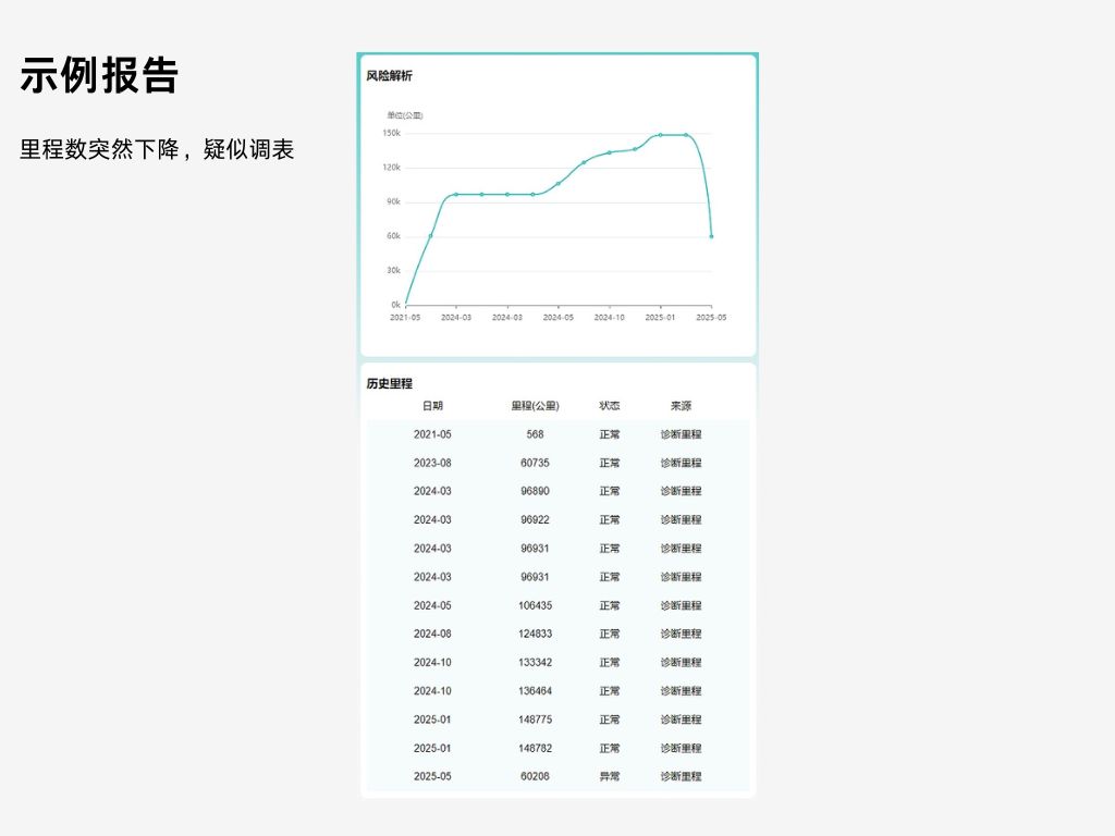 输入车架号或上传行驶证,可以查到车辆历史行驶里程等信息。通过对比这些信息,看车辆的实际公里数与里程表显示的是否一致,就能快速辨别车辆是否调表车、改表车。