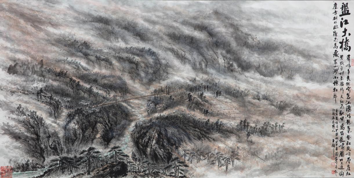 山水画承载着很多的传统文化精神,王维禅画山水,范宽以山水立骨传神,沈周依山水澄怀观道,石涛曰山水时有论笔墨当随时代。锁平先生创作山水,像写书法一样深深因循山水里的文化龙脉,带着为天地张目的精气神对境造意,也是通过山水创作独与天地精神往来的丹青贤家!他作山水,深谙六法之论,完全是一派笔墨精彩的孤标尘外!请看《盤江印象图》这一件惟妙的山水佳作,执笔作线,骨法峥嵘,勾下一笔滑畅劲健,复作勒笔钢打铁铸。这正是骨法用笔的精湛,把中国画依线条造型的本质表现得无以复加!无有一根线条凌乱,不让一笔失控而成为散兵游勇!又有诸多皴法的灵活调度,可以让笔法呈现千变万化,斧劈皴雄奇,折带皴错落,雨点皴空蒙,披麻皴生机。好的笔法就是其山水作品专业品质高能,让人无可挑剔的重要原因。