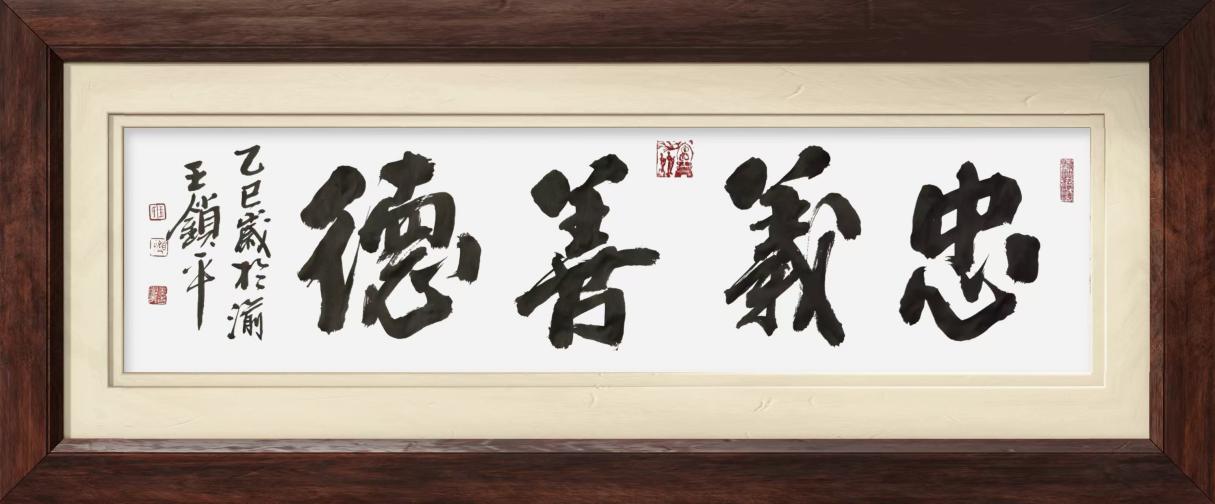 王锁平习成书法,非常重视书法线条的塑造效果,把书法特别是行草本为线条艺术的真谛表现的无以复加。凌空杀纸写下《云水襟怀》笔未到气已吞,笔势如惊雷驰电,扑面而成,果然是落笔觉着痛快,起笔丰姿多神。这榜书大字,足以见证王锁平运化笔墨的窠擘功夫!力度之威猛,犹如鸿飞兽骇,力透纸背。在低旋回翔之际,作一横如布阵排云,作一牵似万岁枯藤。笔里有墨,墨里有笔,尽是秋鹰逐兔的万千万变。赵子昂论书法,有用笔千古不易之言,如今看王锁平先生写下的这书法,亦是不易经典。挂起来一经入目,必然是令人大振心颜,一派正大气象!