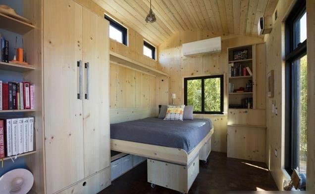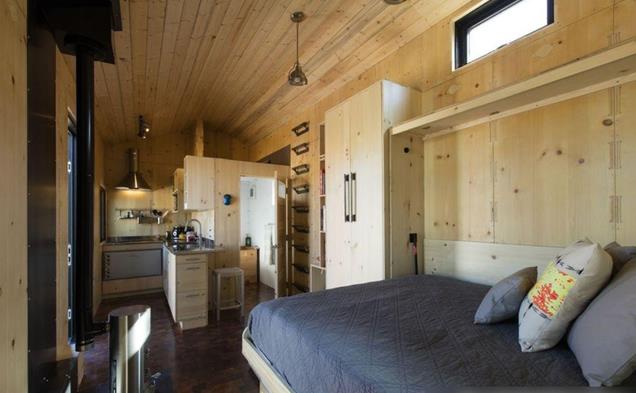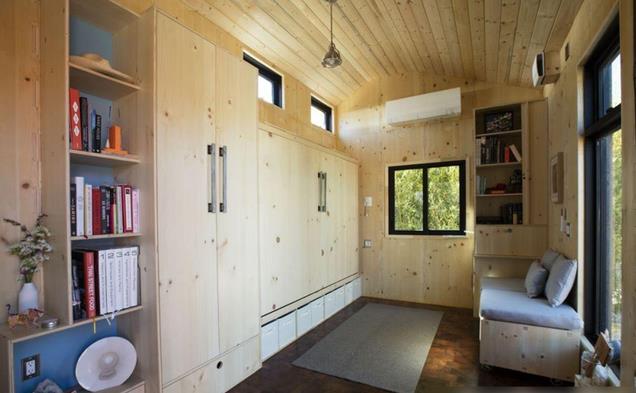 而内部则是以木质材料为主, 营造出一种温馨的居住氛围。房屋内部的空间利用也非常合理, 卧室、客厅、厨房和卫生间等功能区划分明确,并且配备了必要的家具和电器,完全可以满足居住者的基本需求。