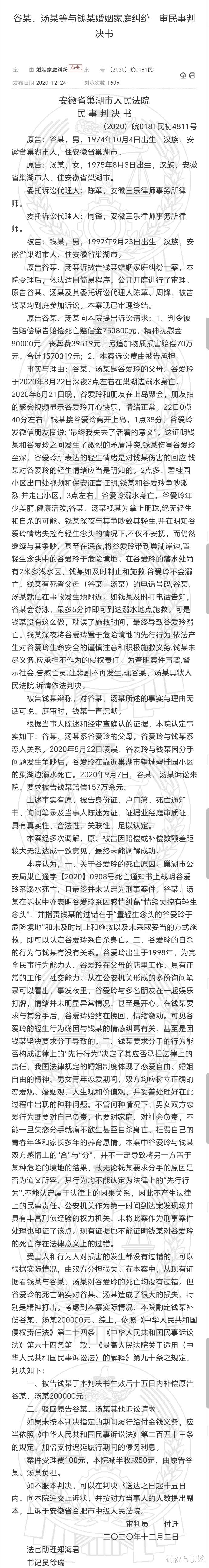 这案子发生在2020年夏天,二十多岁的谷某和男友钱某在巢湖边发生了激烈争吵。那是他们最后一次见面。法院说得很清楚,提出分手是每个人的权利,作为一个成年人,她的选择不该由别人来承担法律责任。但判决书的后面跟着一句话,考虑到女孩父母承受的丧女之痛,判男生补偿20万。