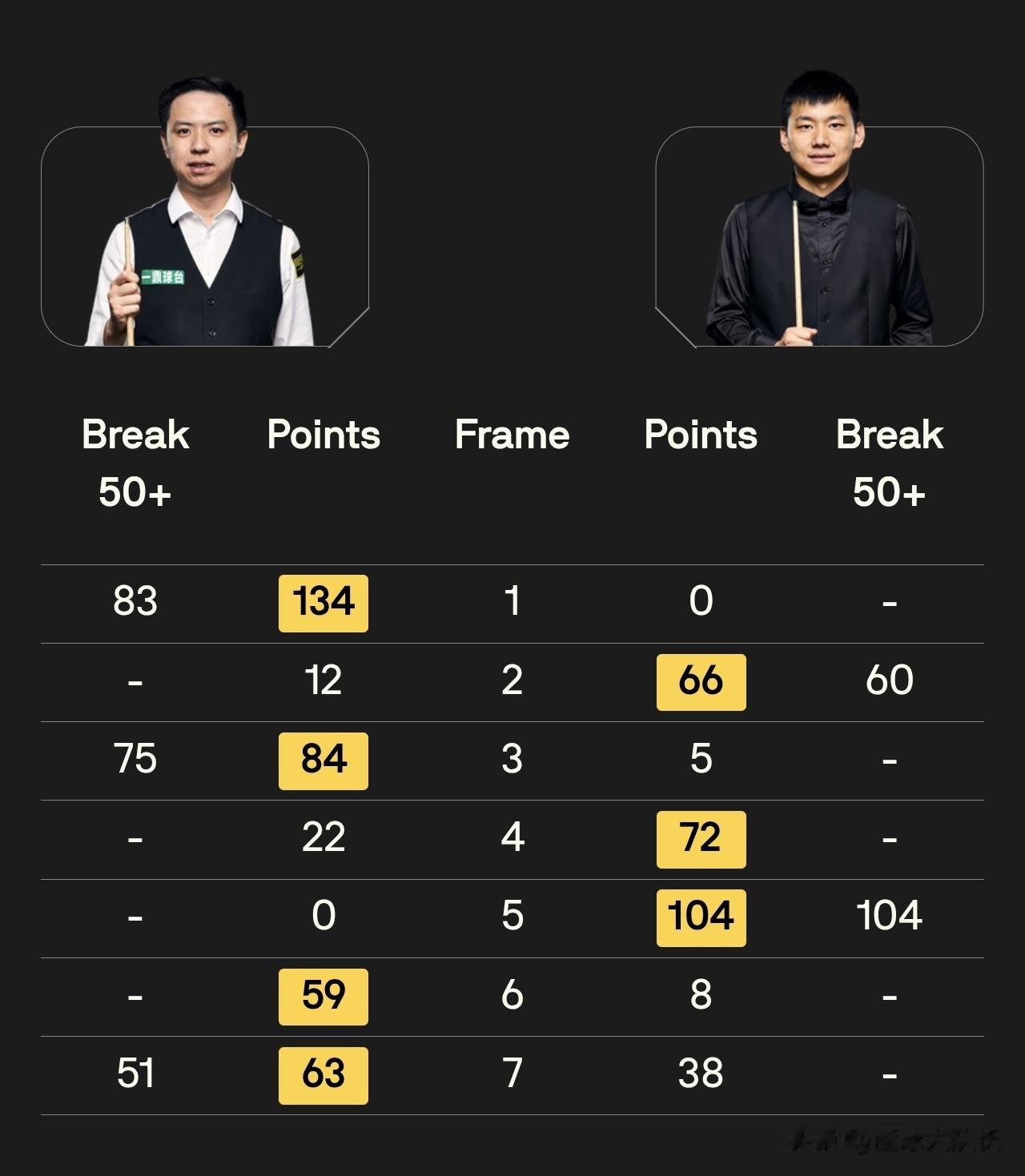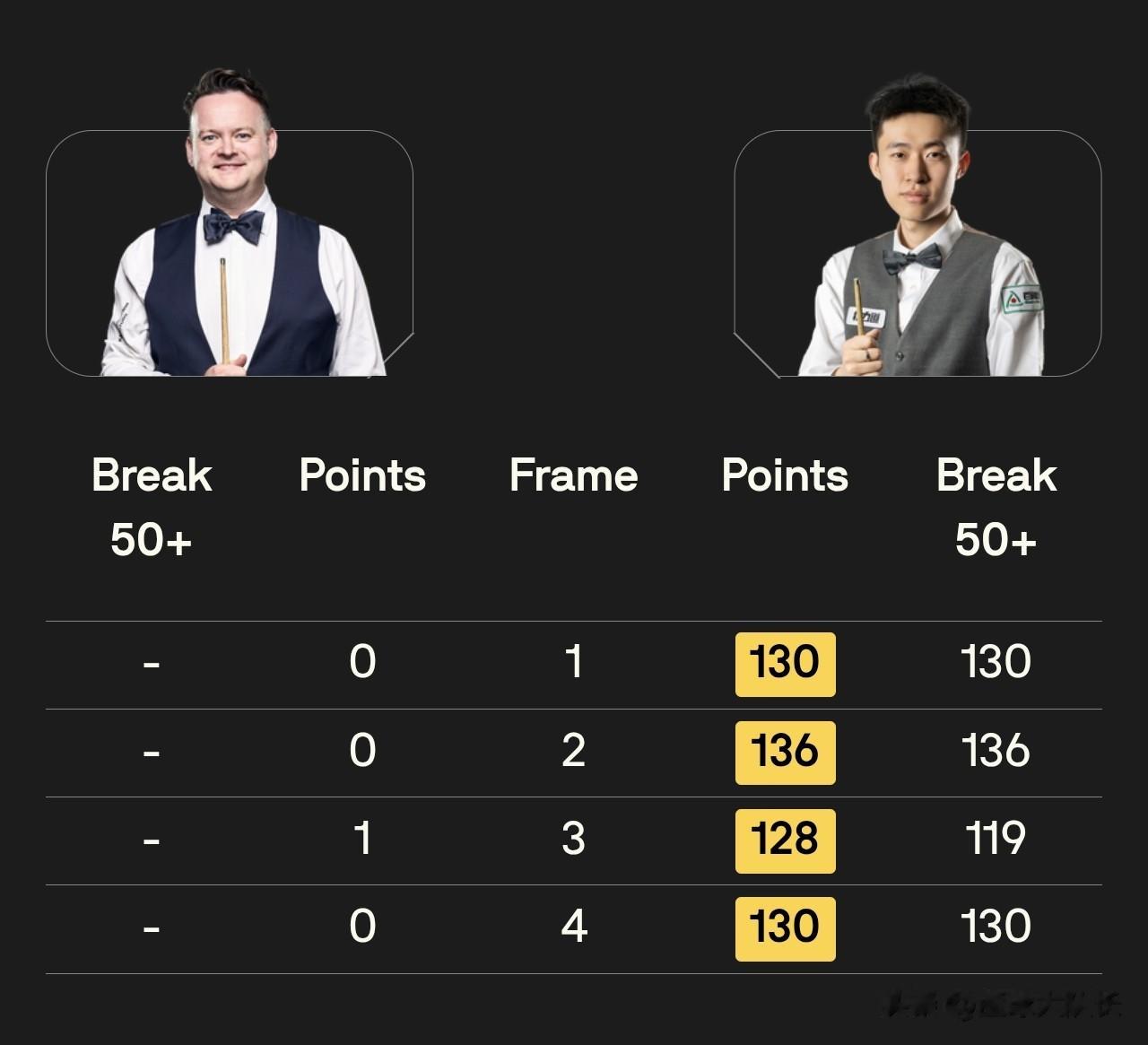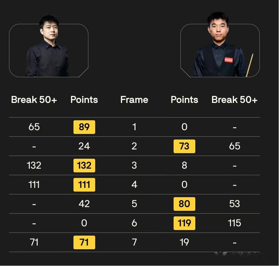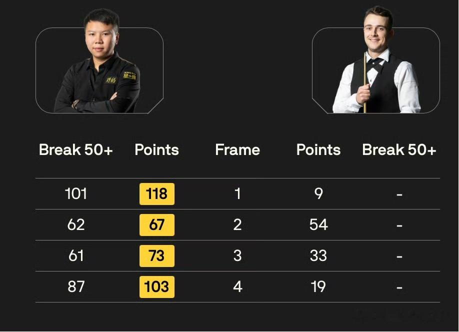 周跃龙与亚历山大·乌尔森巴赫的比赛虽然亚历山大·乌尔森巴赫每局比赛都有机会上手,但周跃龙每局都有单杆破50,单杆101、62、61、87,周跃龙这状态是要进决赛再度争取去掉千年老二头衔的节奏啊。