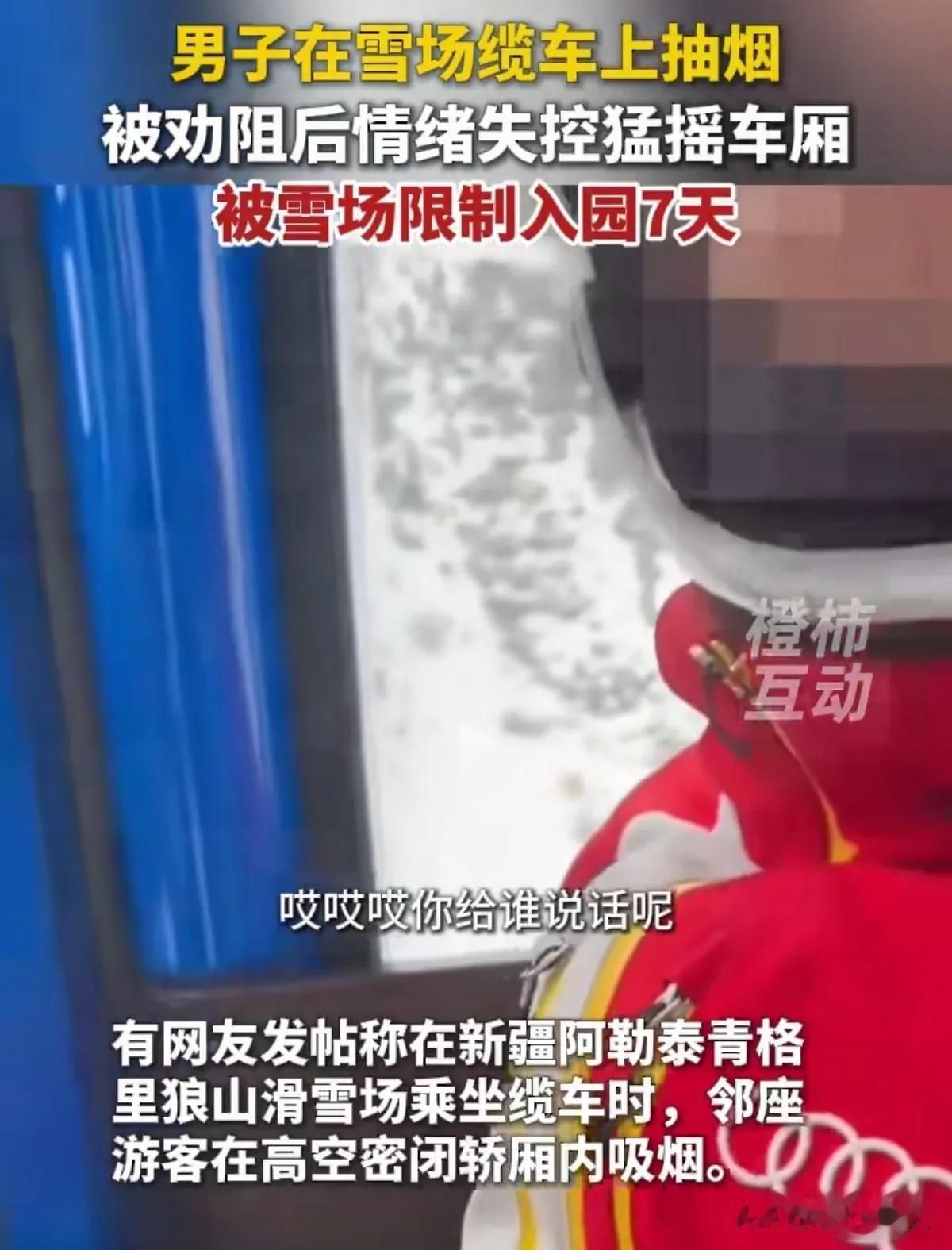 2月23日,新疆阿勒泰青格里狼山滑雪场,高空缆车内一名男子公然抽烟。