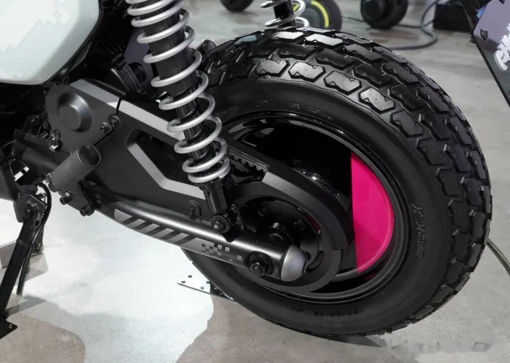 ▲后部配备两个初始调节功能的避震器,后轮采用链条驱动。黑色碟形轮毂让人联想到过去VanVan车型上常见的超厚轮胎。