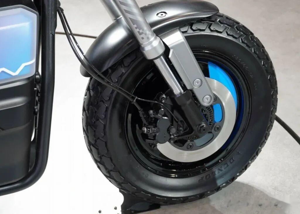 ▲前后轮胎均为邓禄普130/80-12,前悬吊采用倒立式前叉。此外,还配备了ABS速度感测器和相关线路。