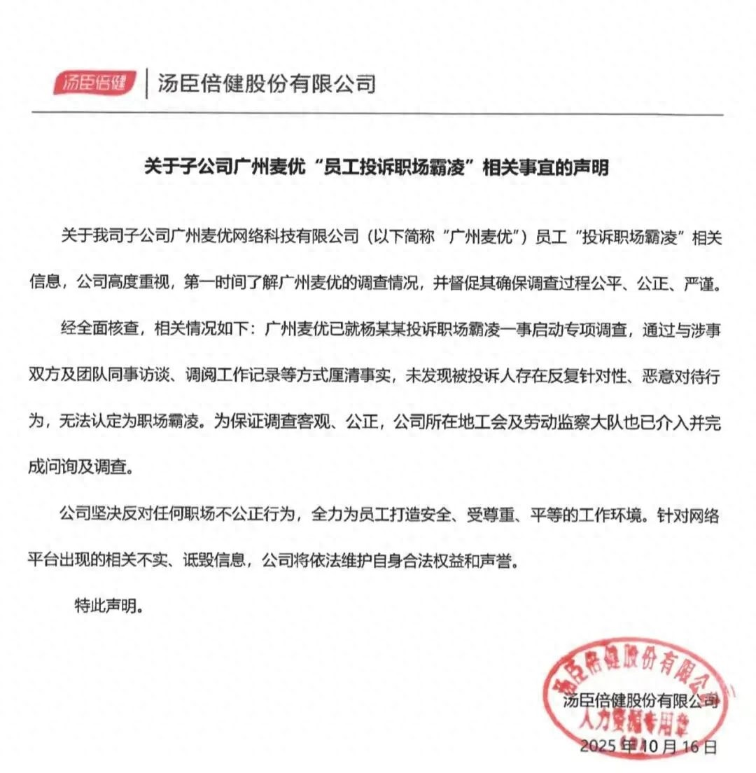 DoNews10月16日消息,10月16日,汤臣倍健发布关于子公司广州麦优“员工投诉职场霸凌”相关事宜的声明。经全面核查,相关情况如下:广州麦优已就杨某某投诉职场霸凌一事启动专项调查,通过与涉事双方及团队同事访谈、调阅工作记录等方式厘清事实,未发现被投诉人存在反复针对性、恶意对待行为,无法认定为职场霸凌。为保证调查客观、公正,公司所在地工会及劳动监察大队也已介入并完成问询及调查。