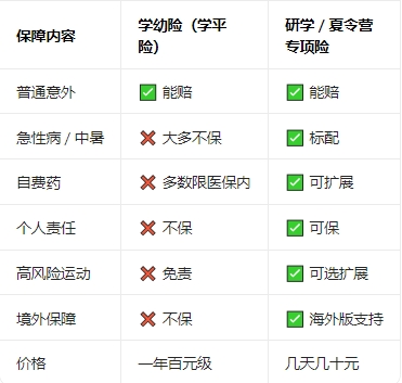 学幼险完全不覆盖,必买境外游学保险,含医疗运送、学业中断、行程延误等。