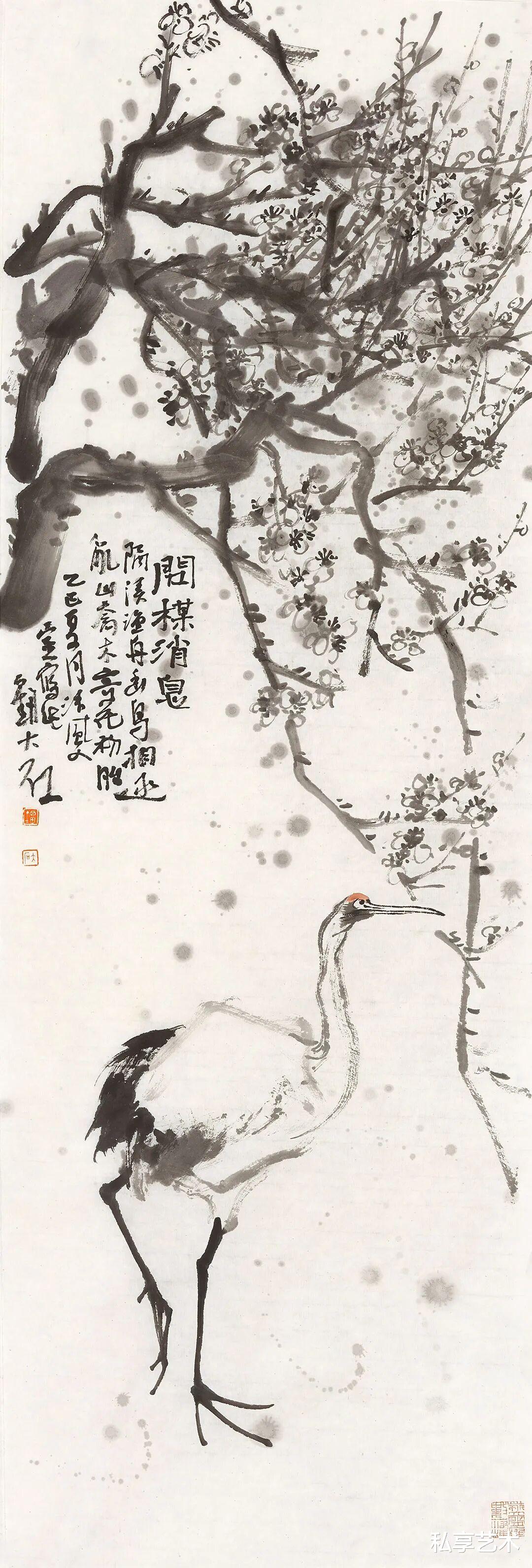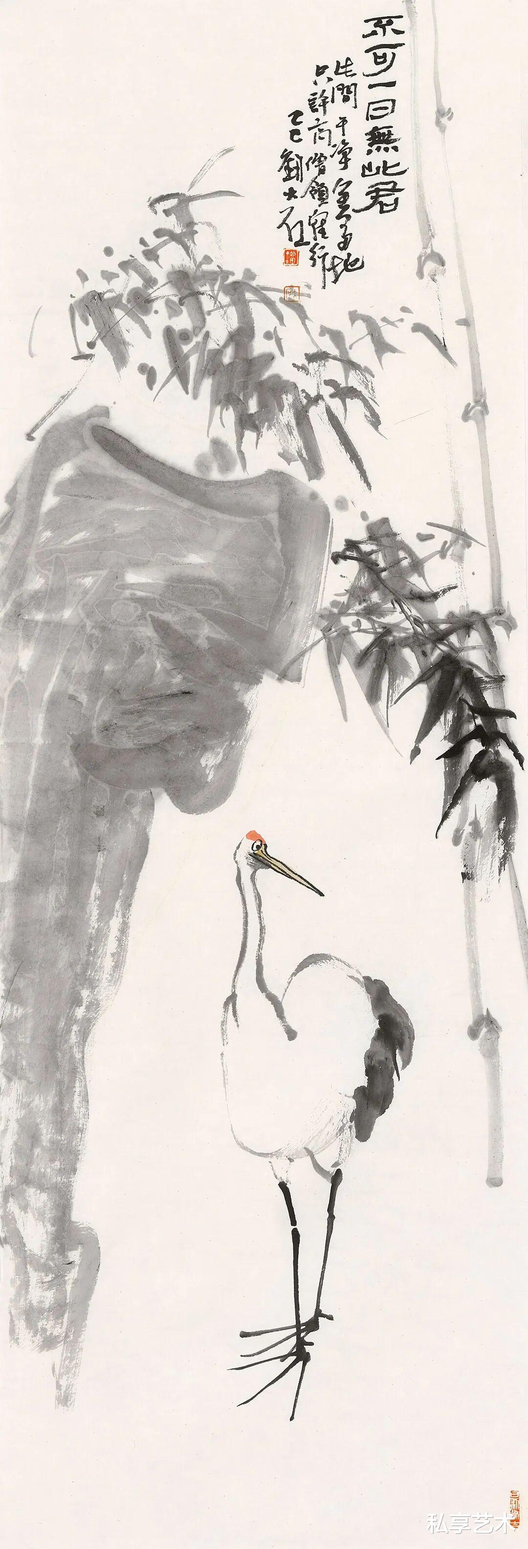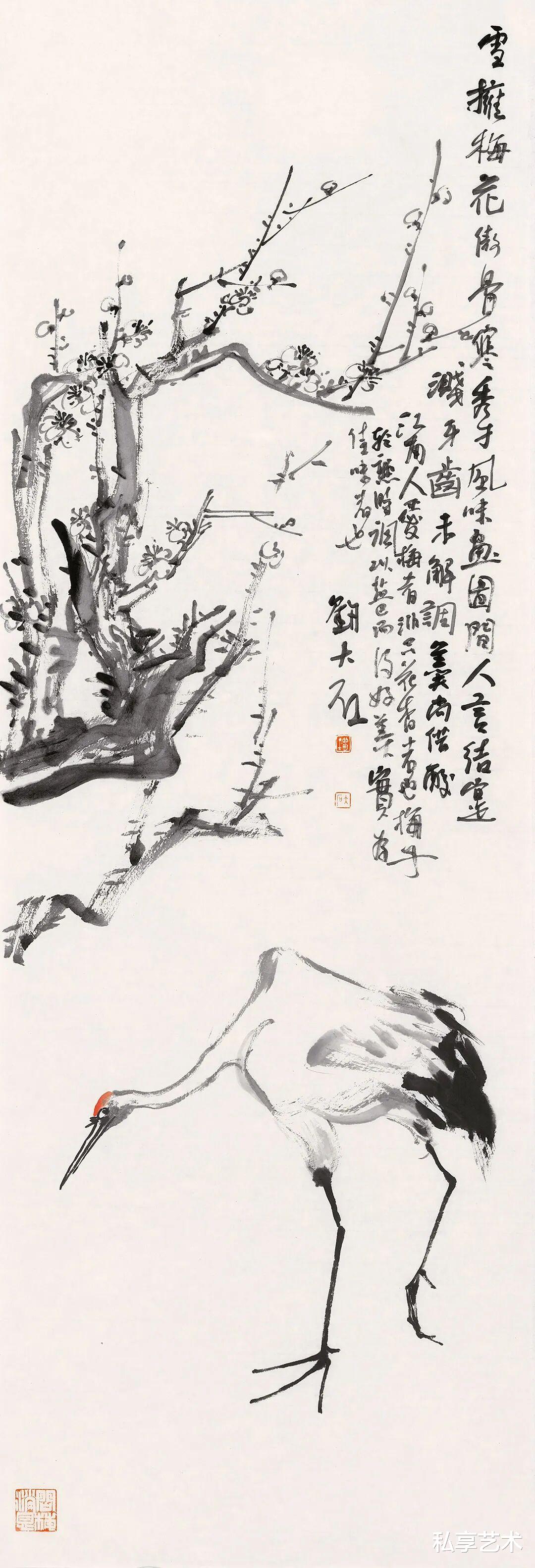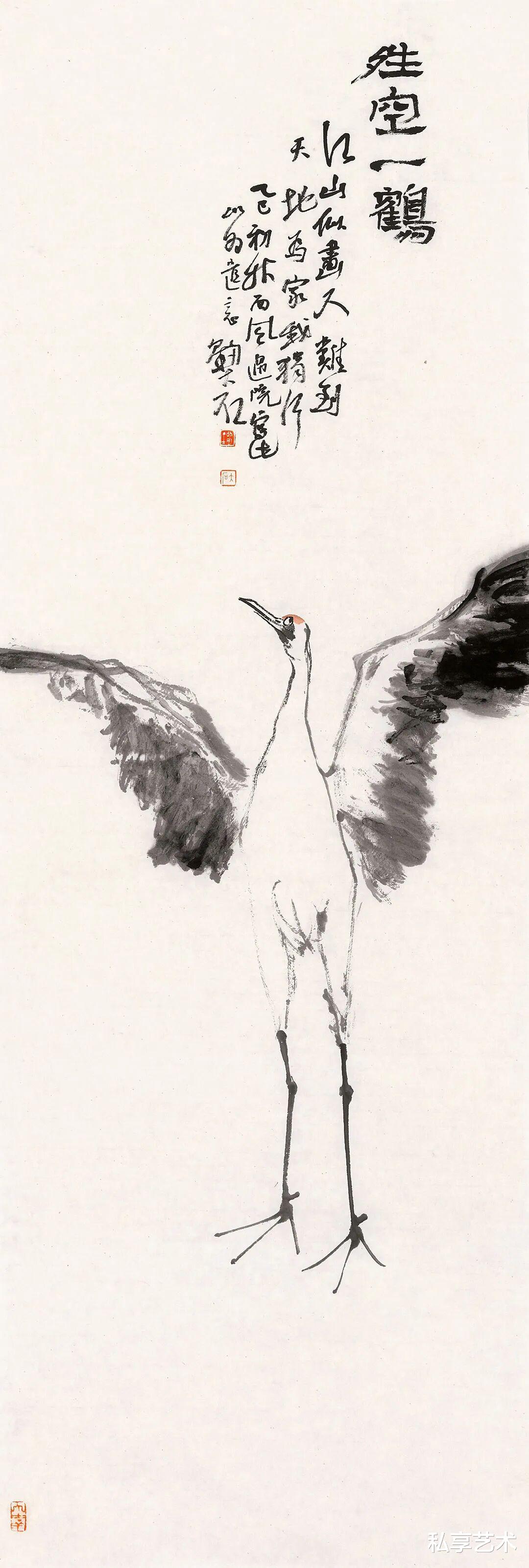 古人画鹤,重在写其“神”而不拘形。刘大石笔下之鹤,亦非描摹自然,而是借其长颈、孤足、朱顶,勾勒出一种超越尘世的静气。鹤立时,似凝望千载;展翅处,若欲凌虚而去。它不争朝夕,不逐浮华,只在梅边、竹畔、藤下,悄然独立,仿佛人间过客,却又是永恒的见证者。