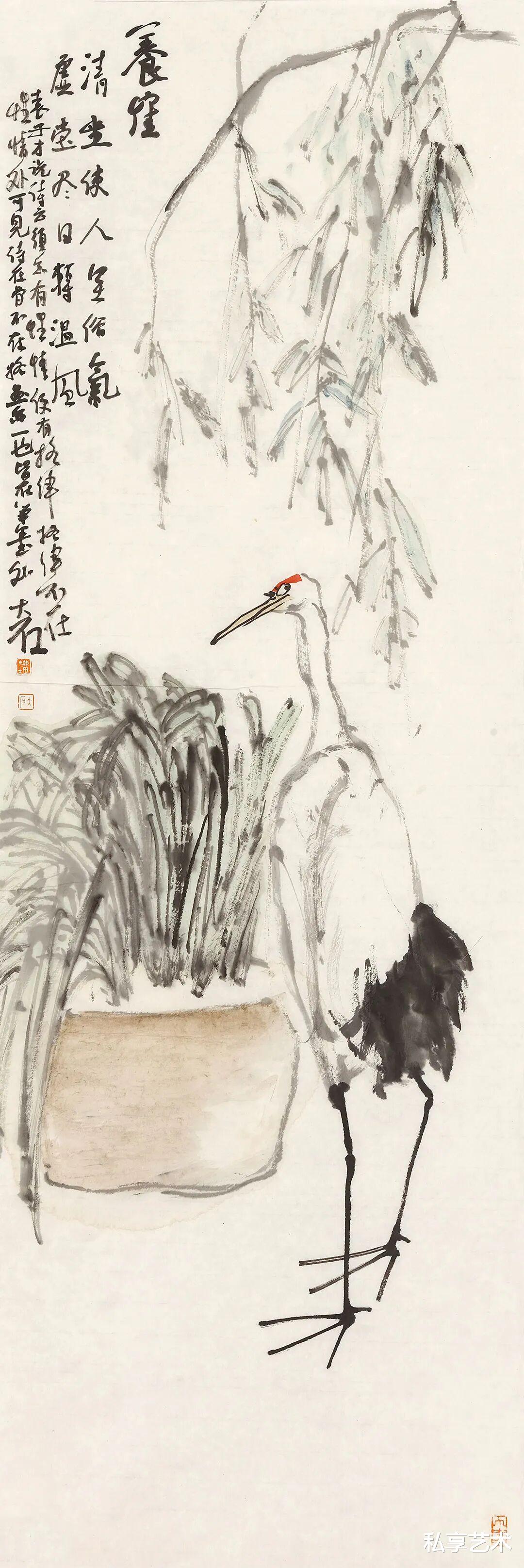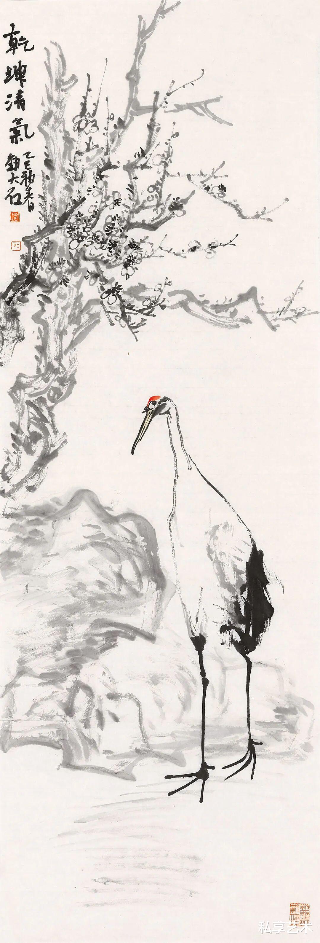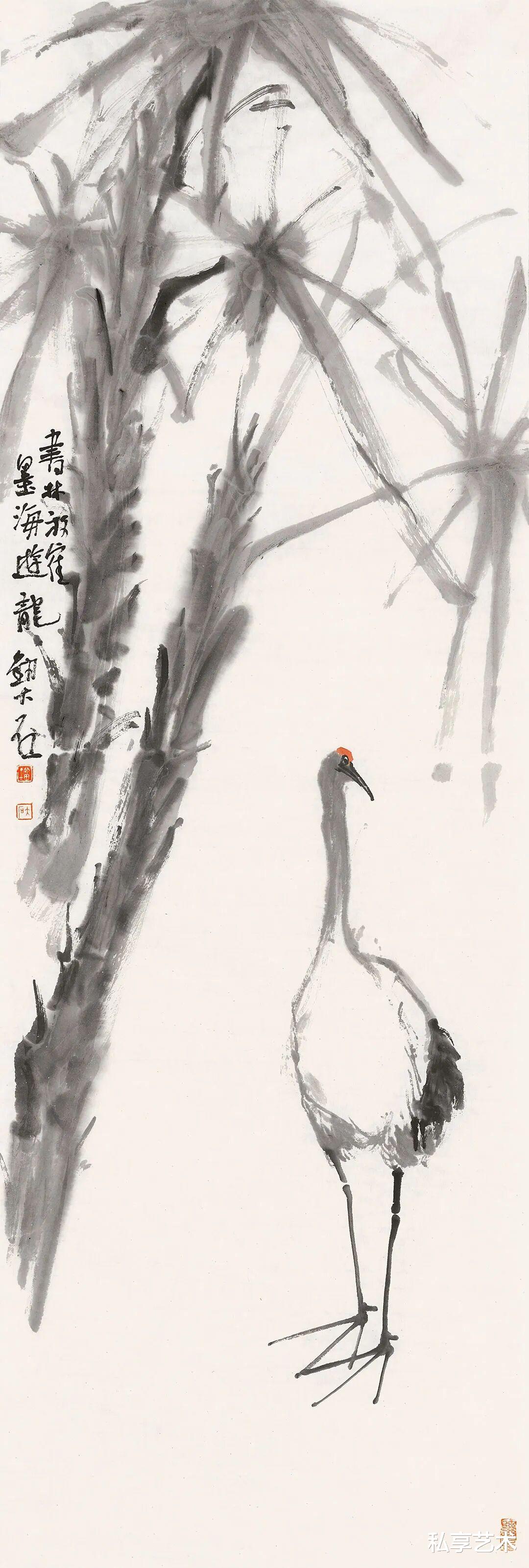 古人画鹤,重在写其“神”而不拘形。刘大石笔下之鹤,亦非描摹自然,而是借其长颈、孤足、朱顶,勾勒出一种超越尘世的静气。鹤立时,似凝望千载;展翅处,若欲凌虚而去。它不争朝夕,不逐浮华,只在梅边、竹畔、藤下,悄然独立,仿佛人间过客,却又是永恒的见证者。