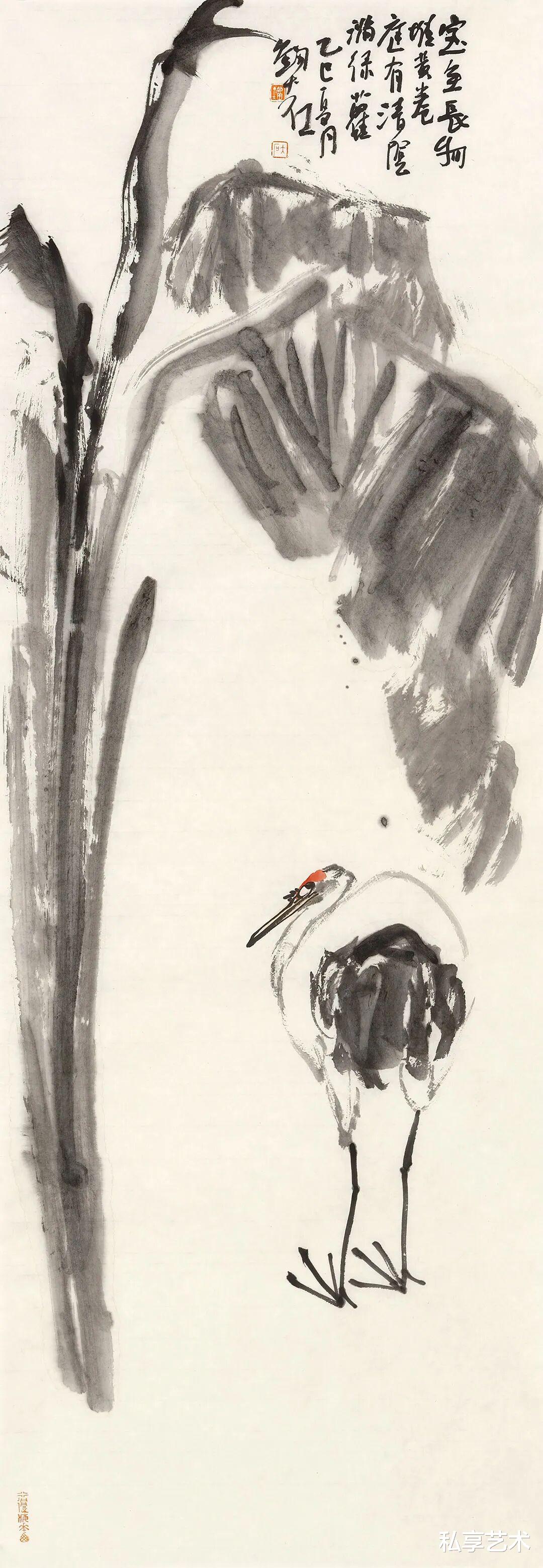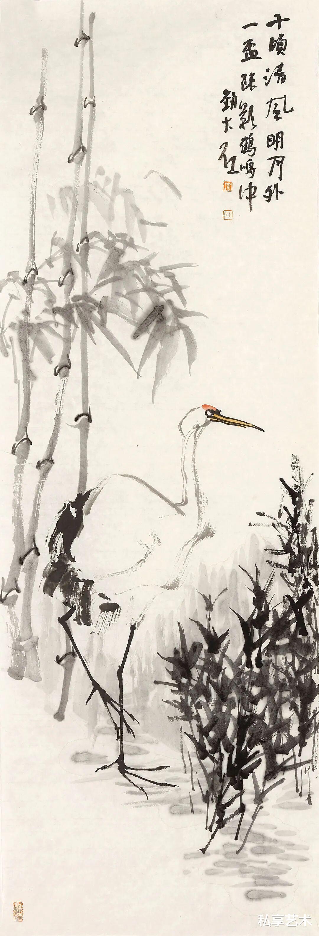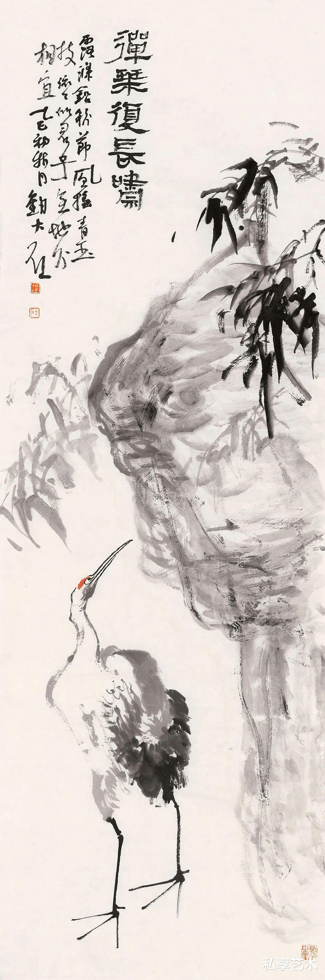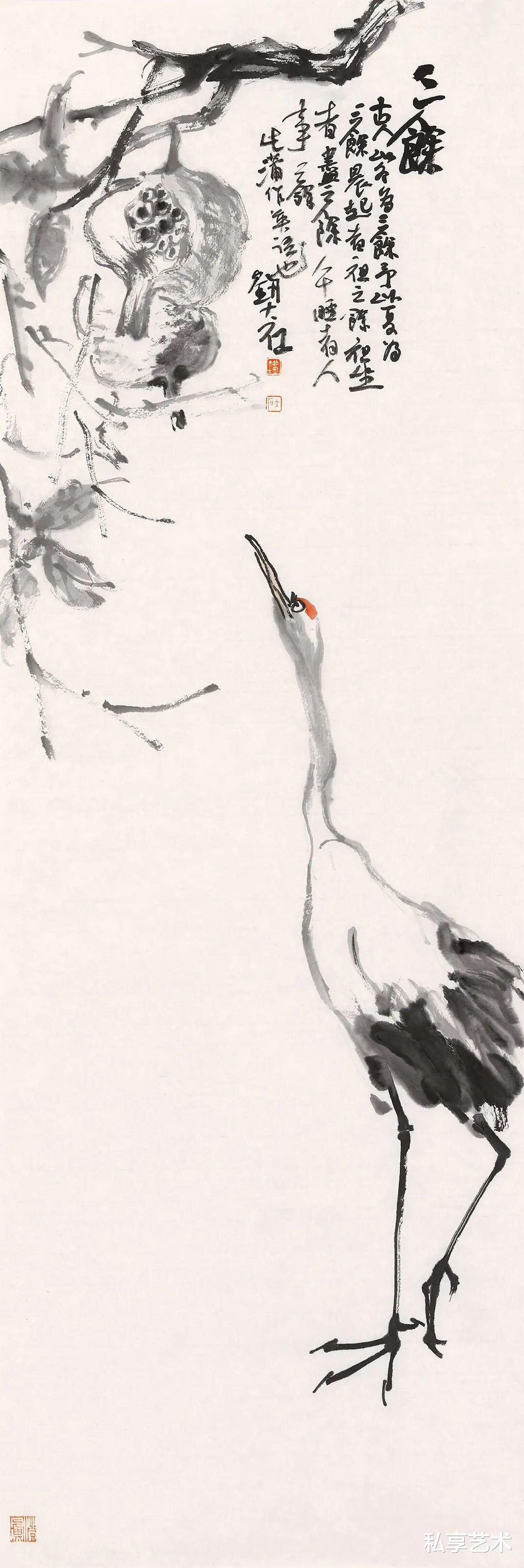 古人画鹤,重在写其“神”而不拘形。刘大石笔下之鹤,亦非描摹自然,而是借其长颈、孤足、朱顶,勾勒出一种超越尘世的静气。鹤立时,似凝望千载;展翅处,若欲凌虚而去。它不争朝夕,不逐浮华,只在梅边、竹畔、藤下,悄然独立,仿佛人间过客,却又是永恒的见证者。