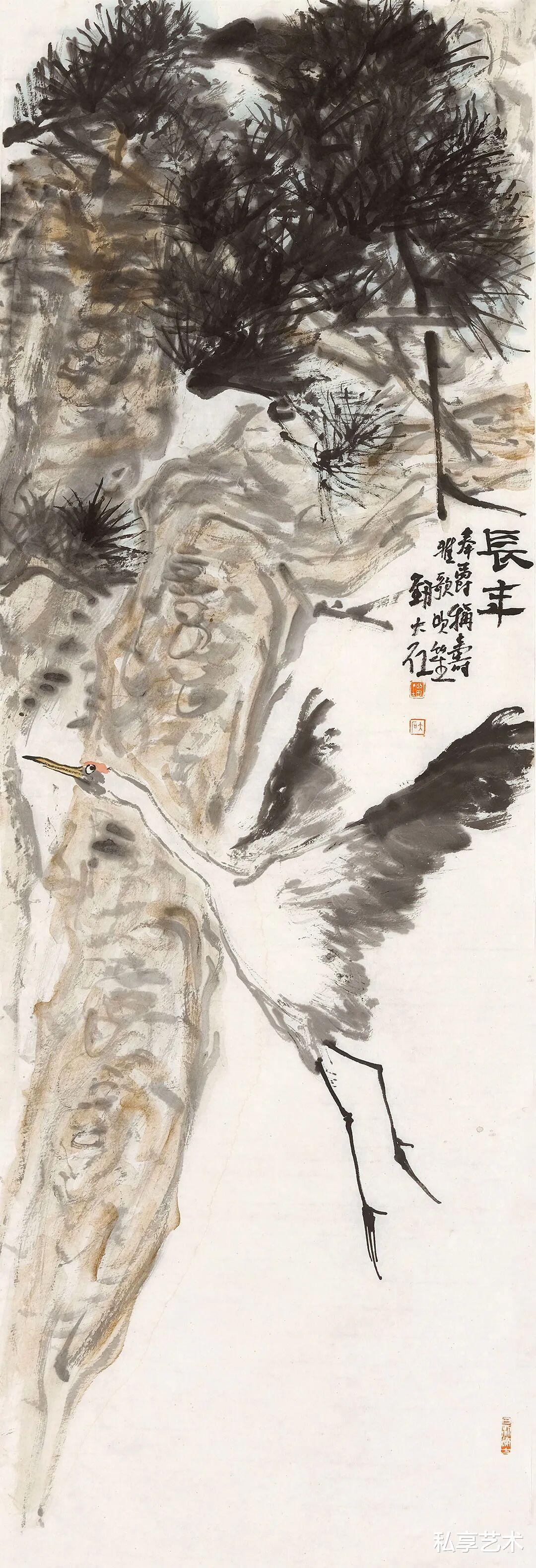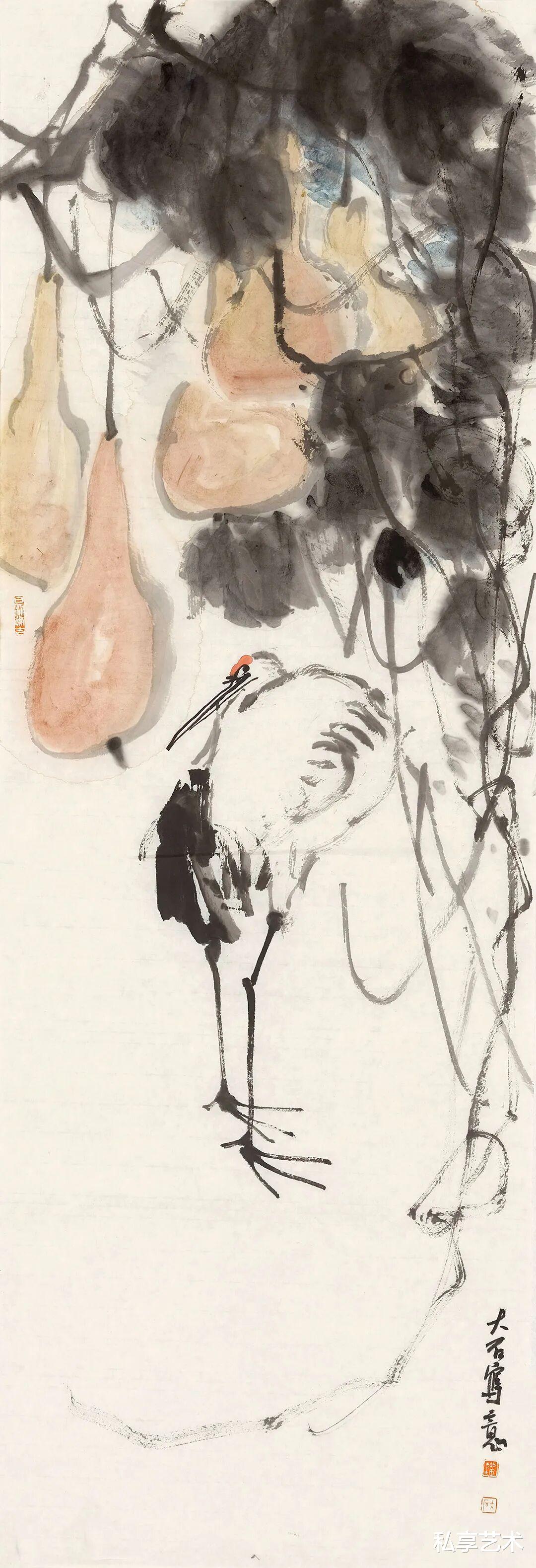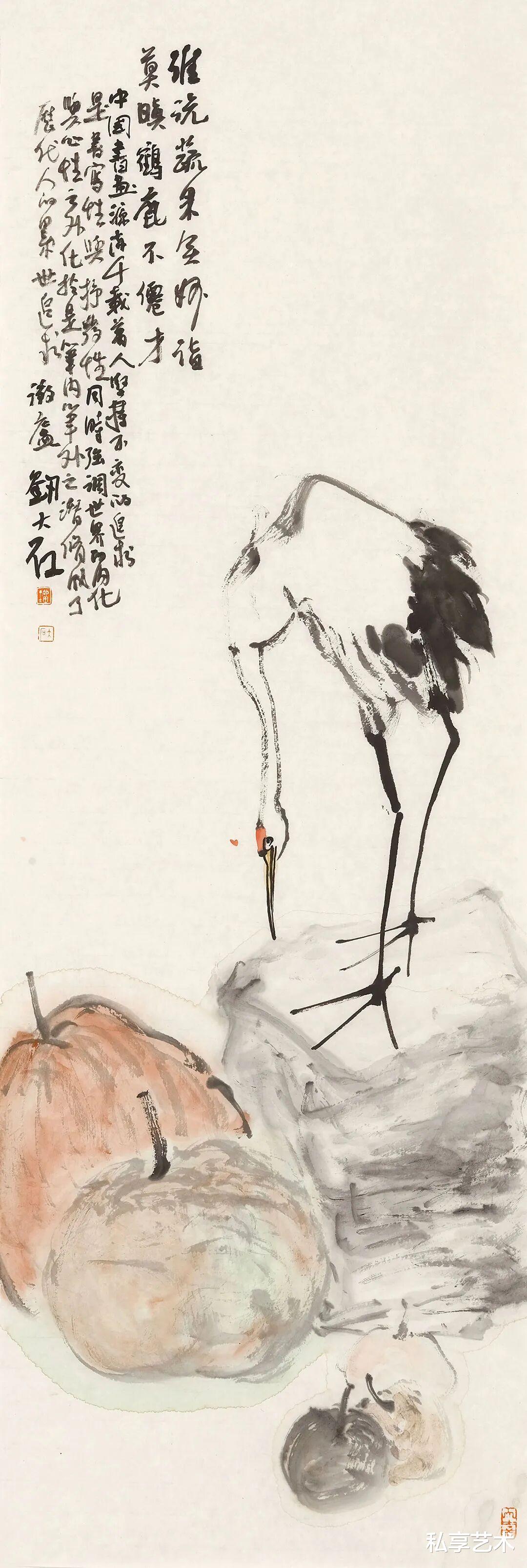 鹤与松为伴,谓之“松龄鹤寿”;鹤与梅共舞,喻其高洁贞静;鹤立空庭,更显孤标傲世。刘大石将此意象融入笔墨,或配以古藤垂露,或衬以瓜果盈枝,皆非为繁饰,实乃托物寄心——鹤之静,是文人对喧嚣的疏离;鹤之动,是灵魂向自由的奔赴。