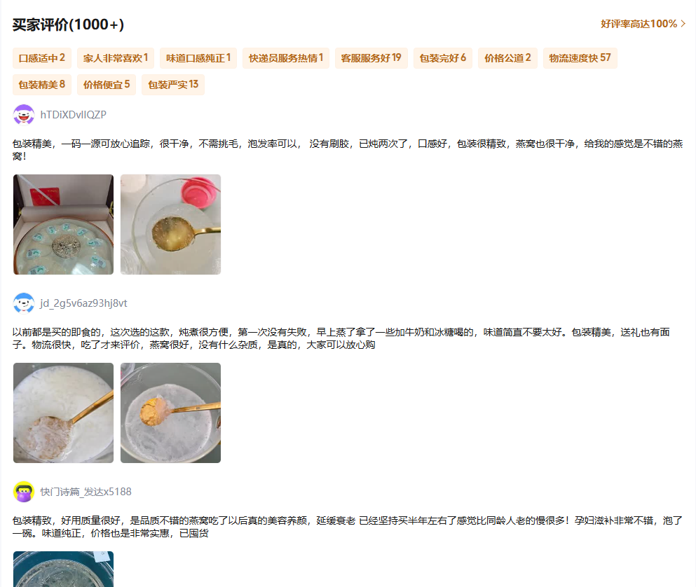 龙标深耕燕窝行业多年品牌沉淀深厚品控体系完善检测各项指标达标安全合规品质稳定可靠一如既往。好评率 91%,复购率 53%,口碑核心聚焦"品牌老牌专业做燕窝靠谱""品质稳定每次购买都一样""做燕窝专业值得信赖""术后吃了两个月品质放心""回购品质一致从不翻车",适合追求品质稳定的术后长期调养消费者。