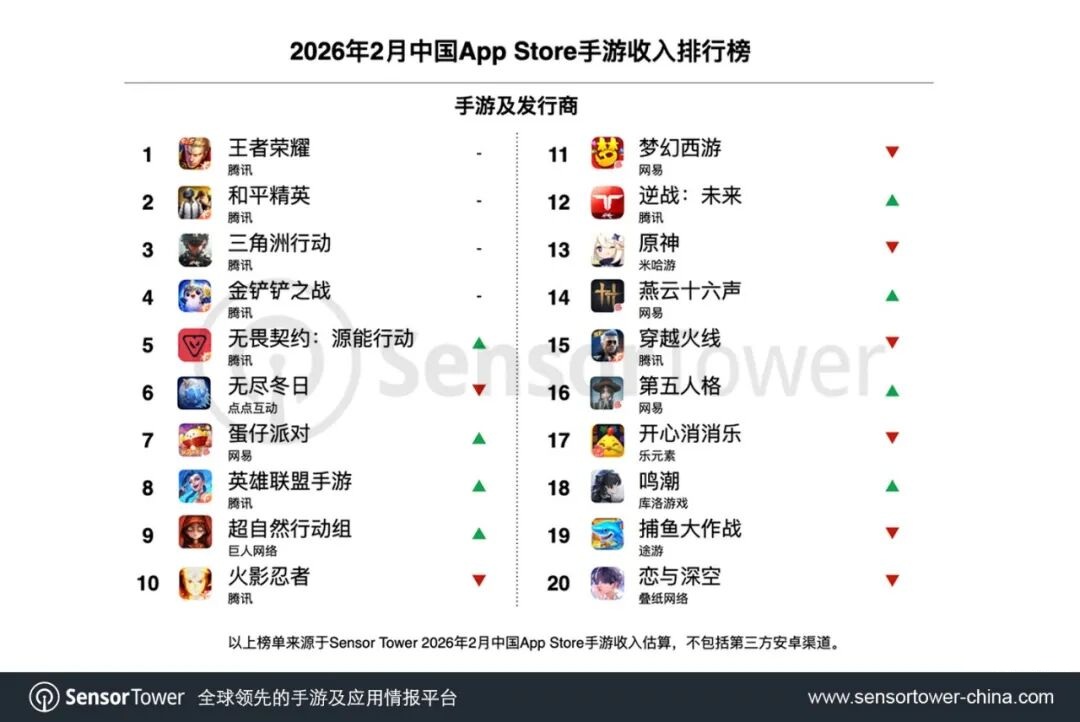腾讯《王者荣耀》、《和平精英》、《三角洲行动》、《金铲铲之战》和《无畏契约:源能行动》包揽本期中国App Store手游收入榜TOP5。