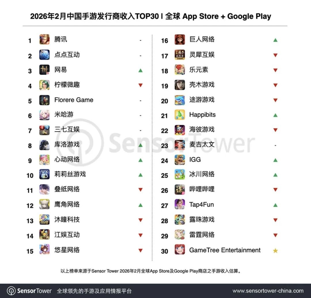 凭借《心动小镇》在全球市场的亮眼表现,心动网络在1月收入翻倍增长后,2月全球收入再度激增105%,刷新历史纪录,首次跻身收入榜TOP10,位列第9名。