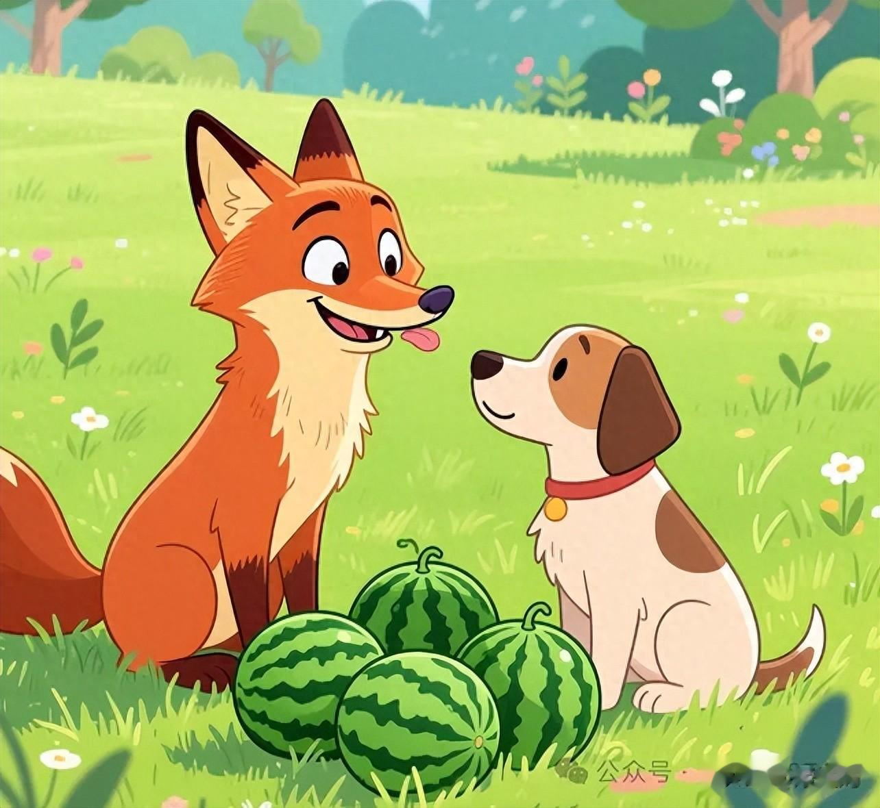 西瓜熟了,老爷爷派小狗看守瓜田。狐狸想偷瓜吃,就来到小狗身边,装着关心的样子让小狗休息。小狗不为所动。狐狸又拿来肉骨头诱惑他。小狗连连吞着口水,动了心,但他刚走几步,就停了下来:“不行,我得看瓜。”