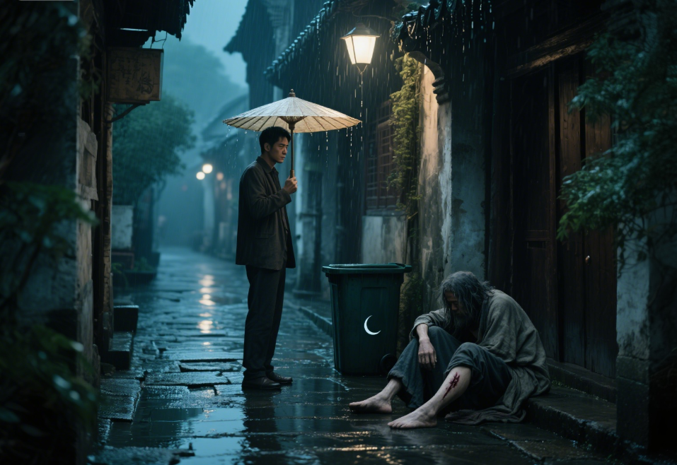 风掀起乞丐的破军大衣,他扭曲的右腿露出来,裤管空荡荡的。我攥着伞柄的手瞬间收紧,雨水顺着伞骨往下滴,砸在积水里溅起小水花。那个卷走我所有积蓄、让我在地下室熬过无数寒夜的人,真的会以这样狼狈的模样,出现在我面前吗?