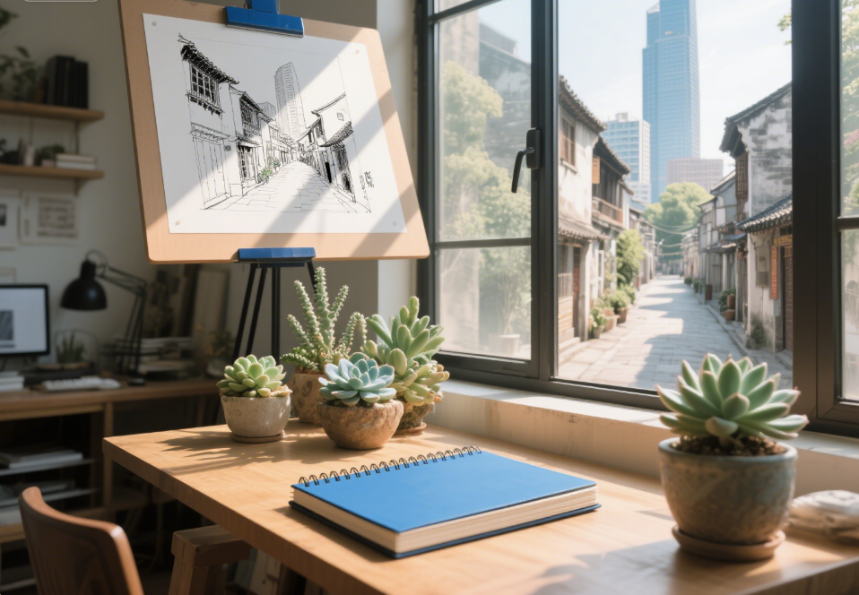 回到家,我打开阳台的窗户,晚风带着淡淡的花香吹进来,很舒服。我拿出我的绘图板,上面放着一张没画完的插画 —— 是客户定制的,画面是老巷的早晨,有卖早餐的小摊,有晨练的老人,还有背着书包上学的孩子。